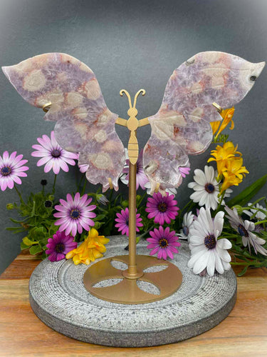 High Quality Pink Amethyst Flower Agate Crystal Butterfly Wings Gold Stand