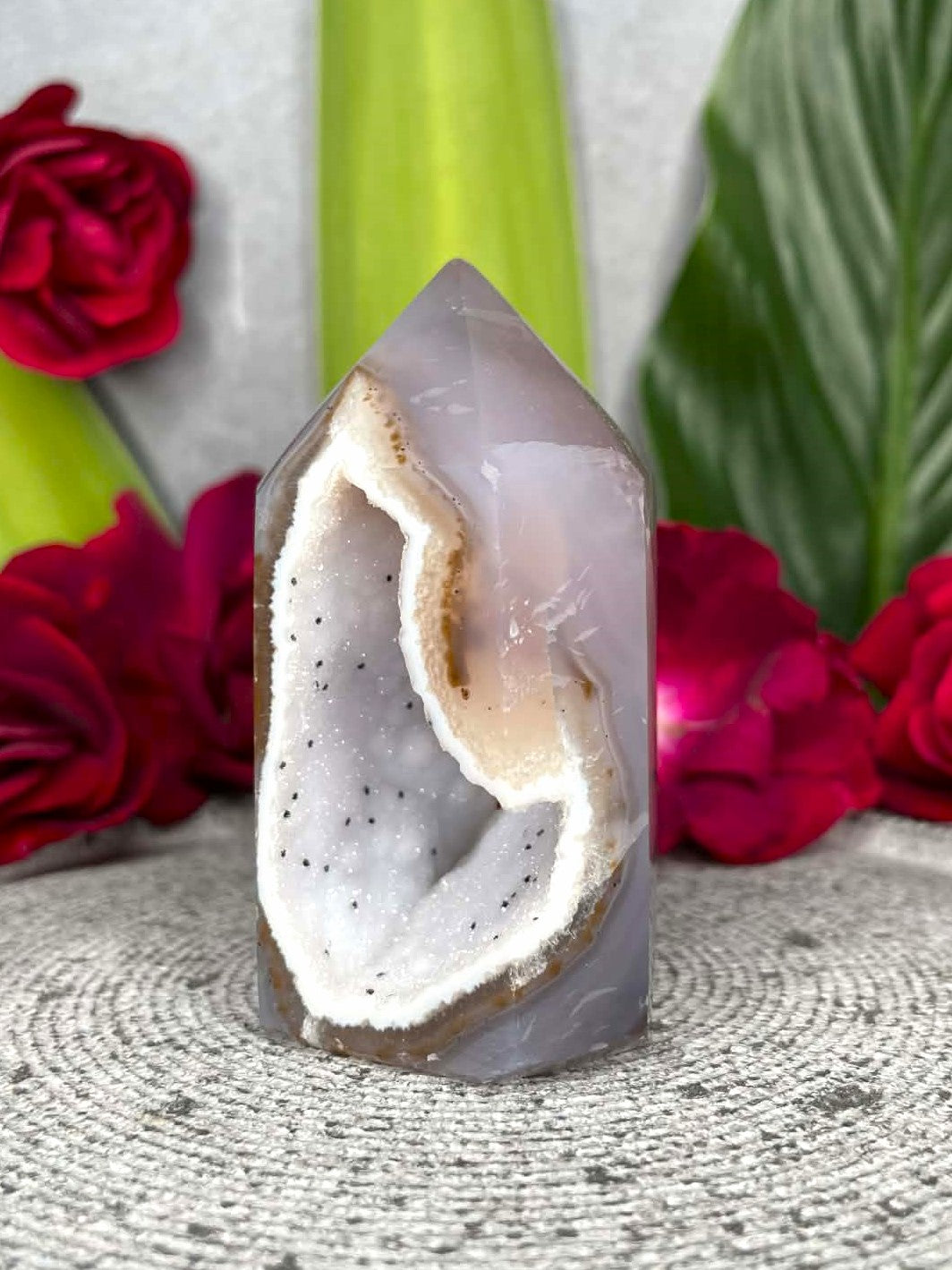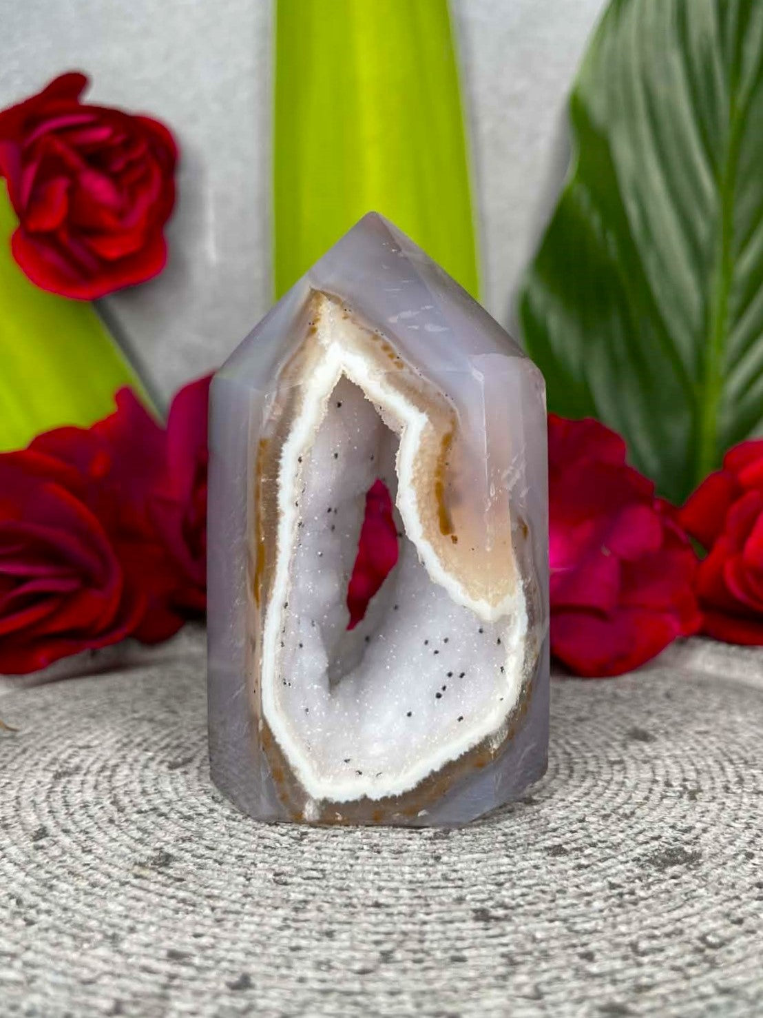 Agate is known for promoting balance, grounding, and emotional harmony, while druzy crystals are believed to uplift energy and encourage positivity. The tower shape helps focus and direct energy, making this piece ideal for meditation, energy work, or as a striking statement crystal in any space.
