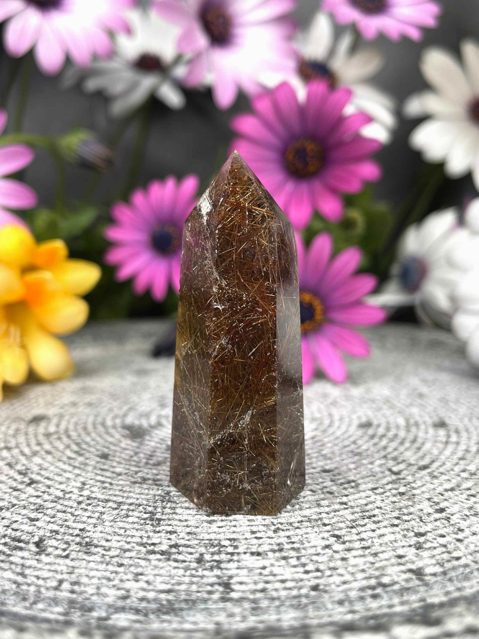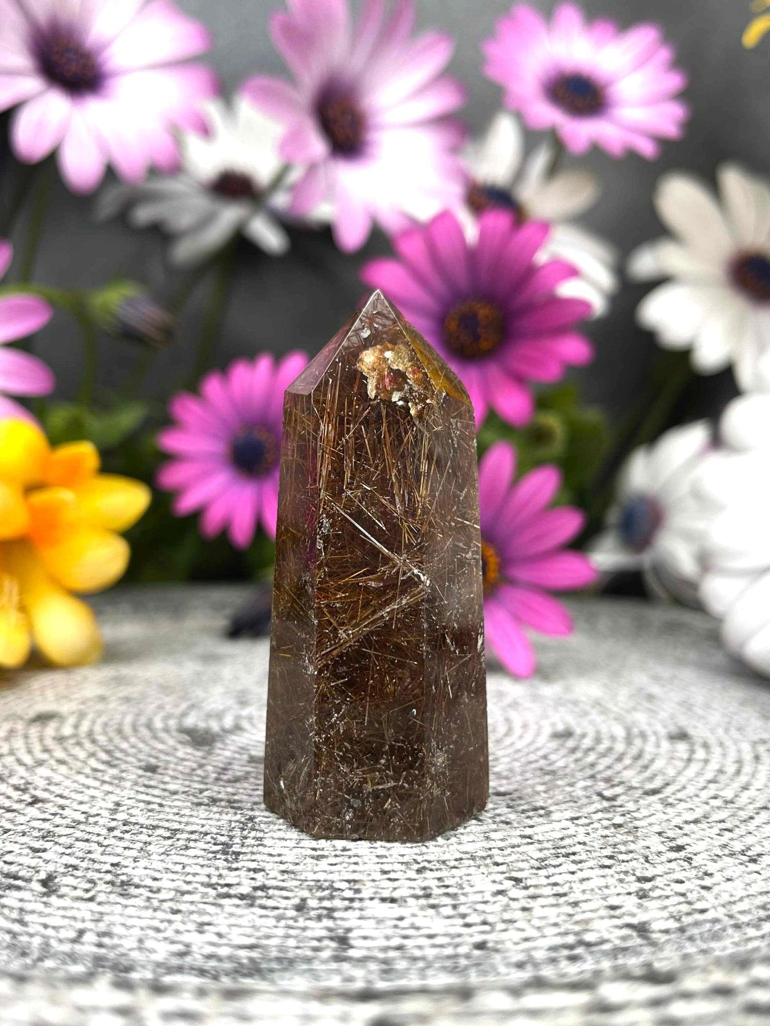 Rutile Quartz is celebrated as a stone of clarity, manifestation, and energy amplification. The golden inclusions are said to illuminate the mind, dissolve negativity, and inspire confidence and creativity. In tower form, it directs this energy upward, enhancing focus, uplifting the spirit, and creating a vibrant, harmonious atmosphere in any space.