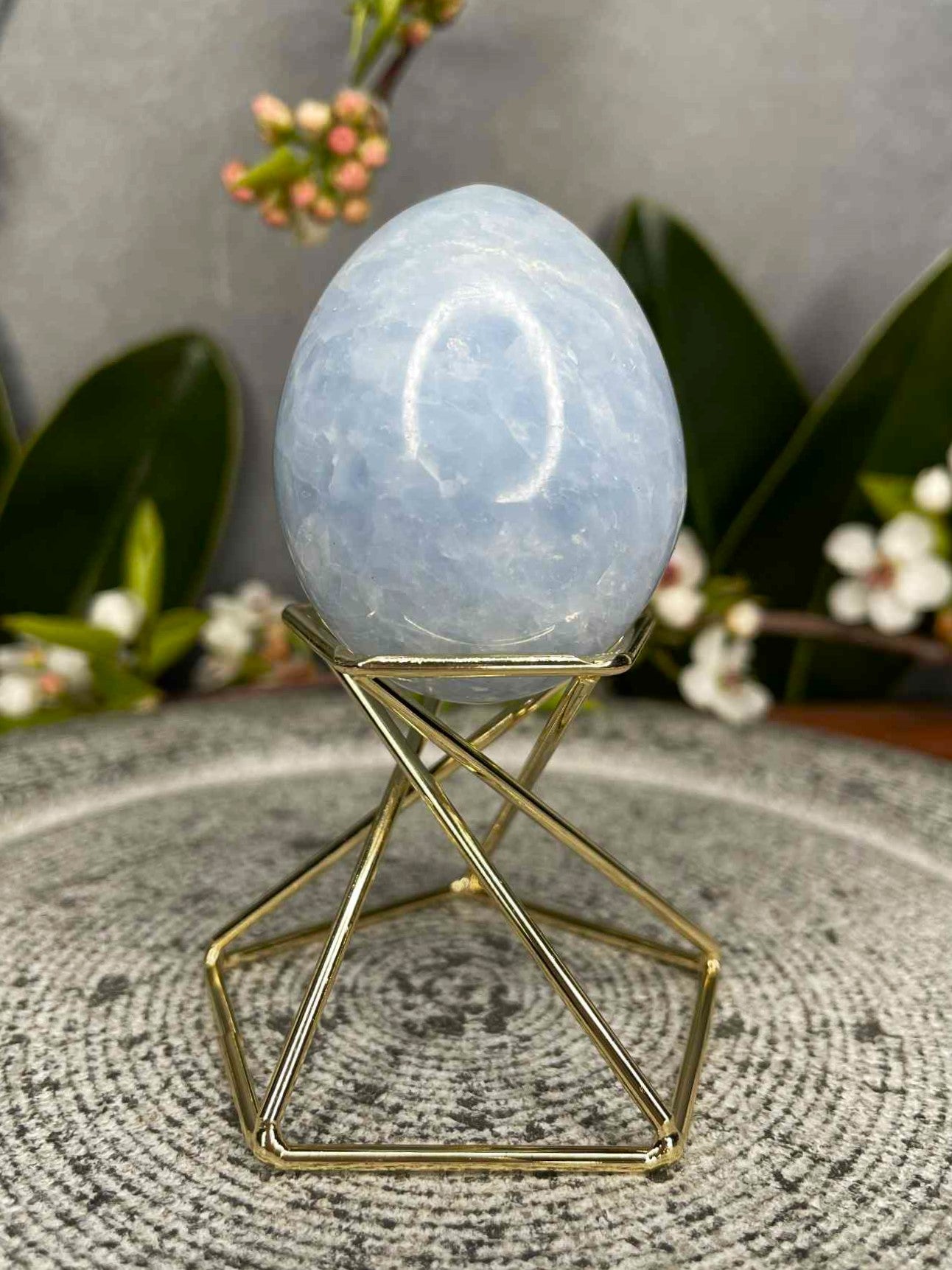 Celestite is widely known as a crystal of peace, clarity, and higher guidance. It is believed to quiet the mind, ease worries, and strengthen spiritual awareness. Many use Celestite in meditation to connect with intuition, invite serenity, and bring a sense of balance to both heart and mind. Shaped into an egg, this crystal becomes a powerful symbol of renewal and gentle protection, making it a thoughtful addition to any collection.
