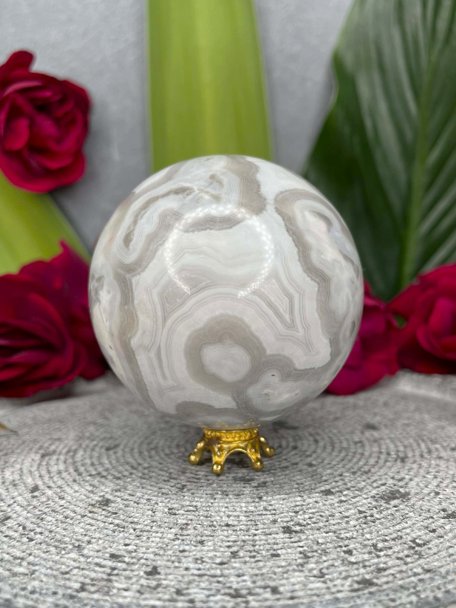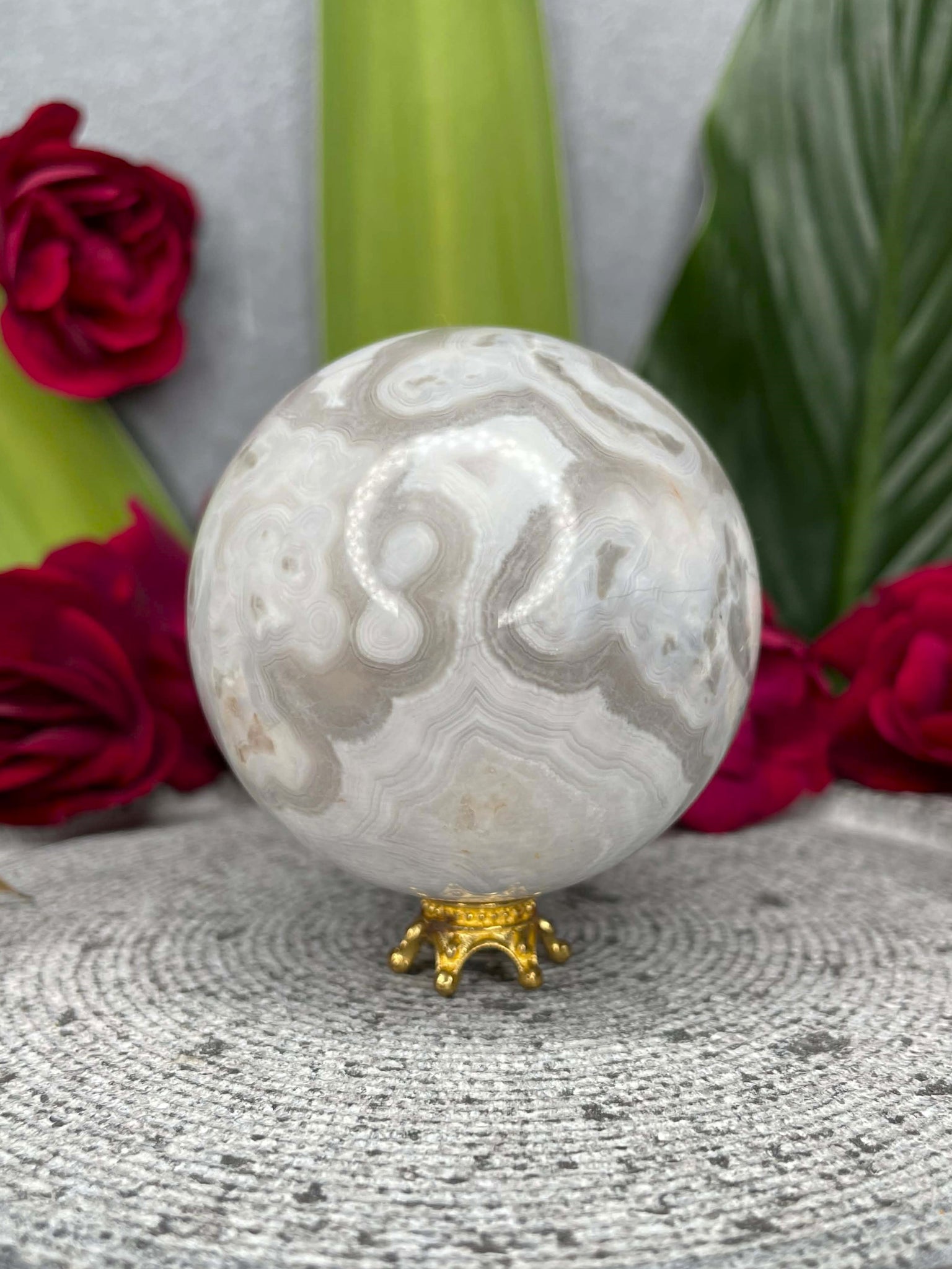 White Agate is a calming and protective stone known for its soft, flowing bands of cream, grey and milky white that create a serene, cloud-like appearance. Polished into a sphere, this piece beautifully showcases the natural lace patterns of agate, symbolising wholeness, harmony and balance while radiating gentle, soothing energy throughout a space.