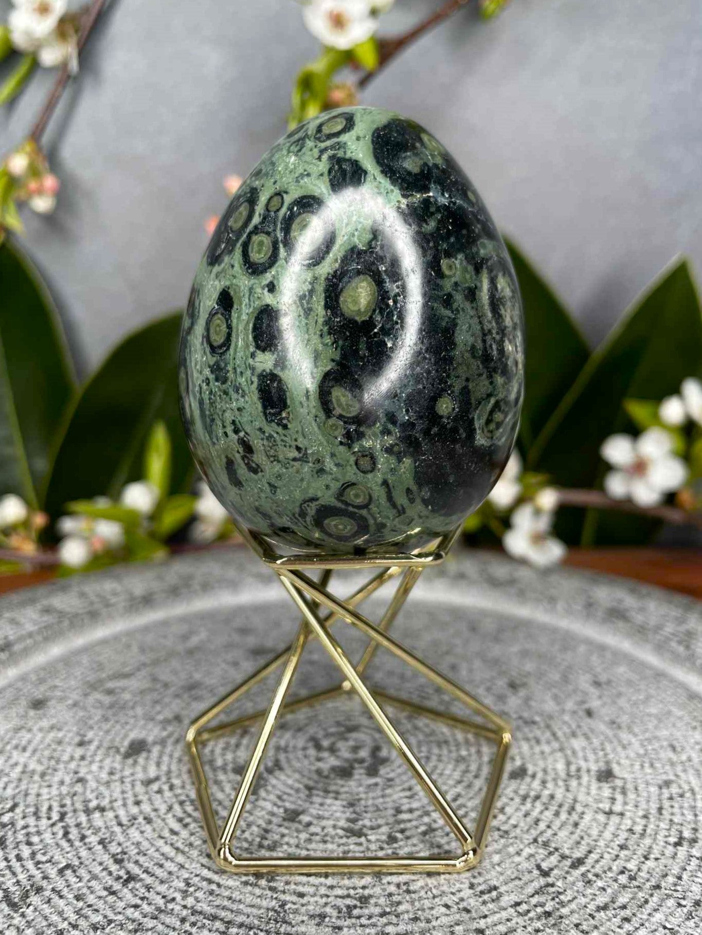 Kambaba Jasper is widely known as a stone of peace, resilience, and balance. It is believed to dissolve stress, ease negative thoughts, and encourage emotional stability. Many use this crystal in meditation to connect with inner strength, foster a calm heart, and deepen their bond with the Earth’s energies. Shaped into an egg, it becomes a powerful symbol of grounding and regeneration, making it a meaningful and protective addition to any crystal collection.