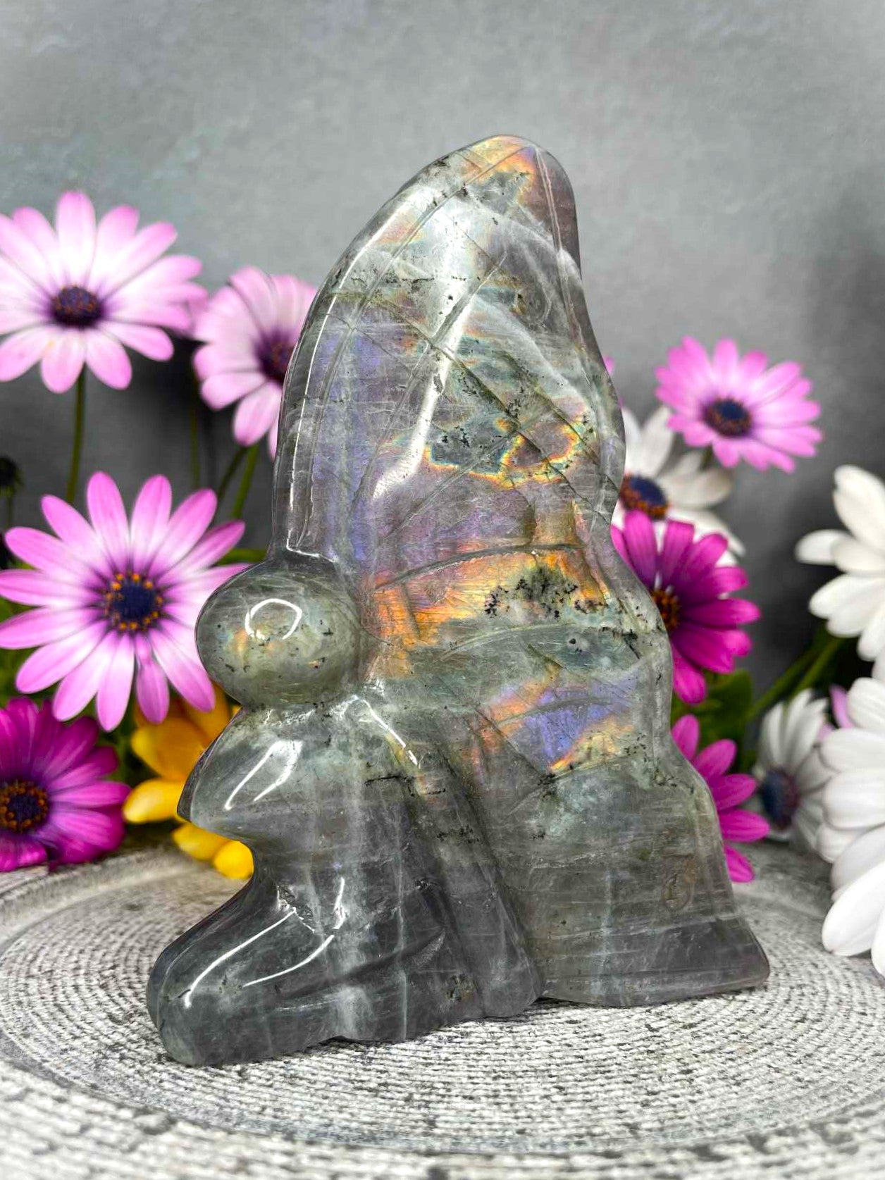 Enchanting and full of wonder, this Labradorite Crystal Fairy Carving shines with vibrant colourful flashes in the sunlight. Carefully carved, the fairy’s delicate wings and graceful form highlight the natural beauty and mystical energy of labradorite.