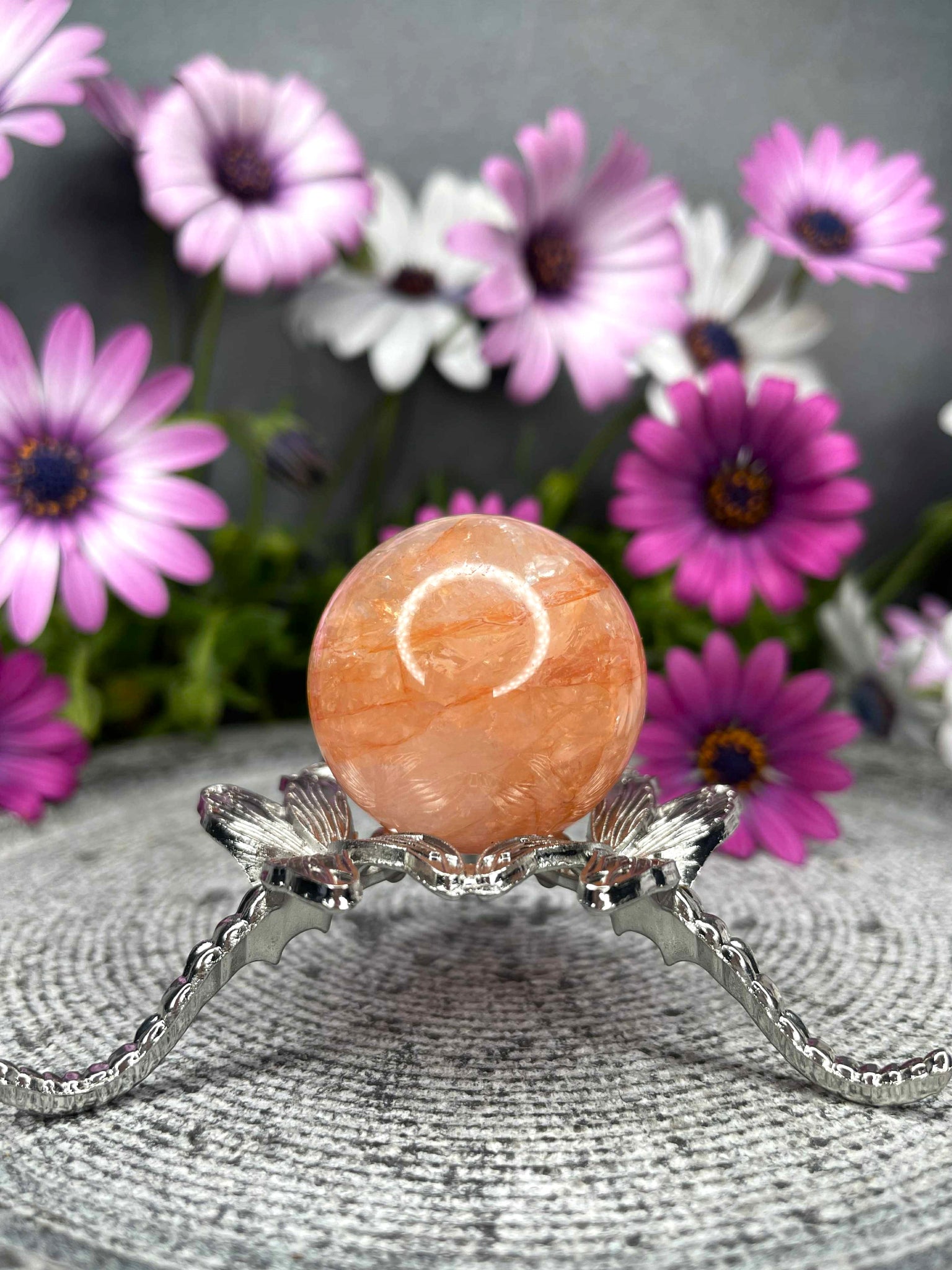This beautiful fire quartz (hematoid) crystal sphere features warm, fiery inclusions of red and orange hematite dancing within clear quartz. Its smooth, polished surface highlights the natural veining and depth of color, creating a stunning visual effect that catches the light from every angle. Compact and elegant, it’s the perfect size for display, energy work, or carrying in your space.