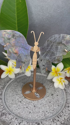 These Labradorite Crystal Butterfly Wings shimmer with a stunning violet flash that dances across the surface as they catch the light, revealing layers of deep grey, blue, and purple tones within the stone. Each wing is uniquely patterned, creating a mesmerising play of colour and movement, beautifully displayed on an elegant gold stand. Both eye-catching and sophisticated, this piece makes a striking statement in any home, altar, or sacred space.