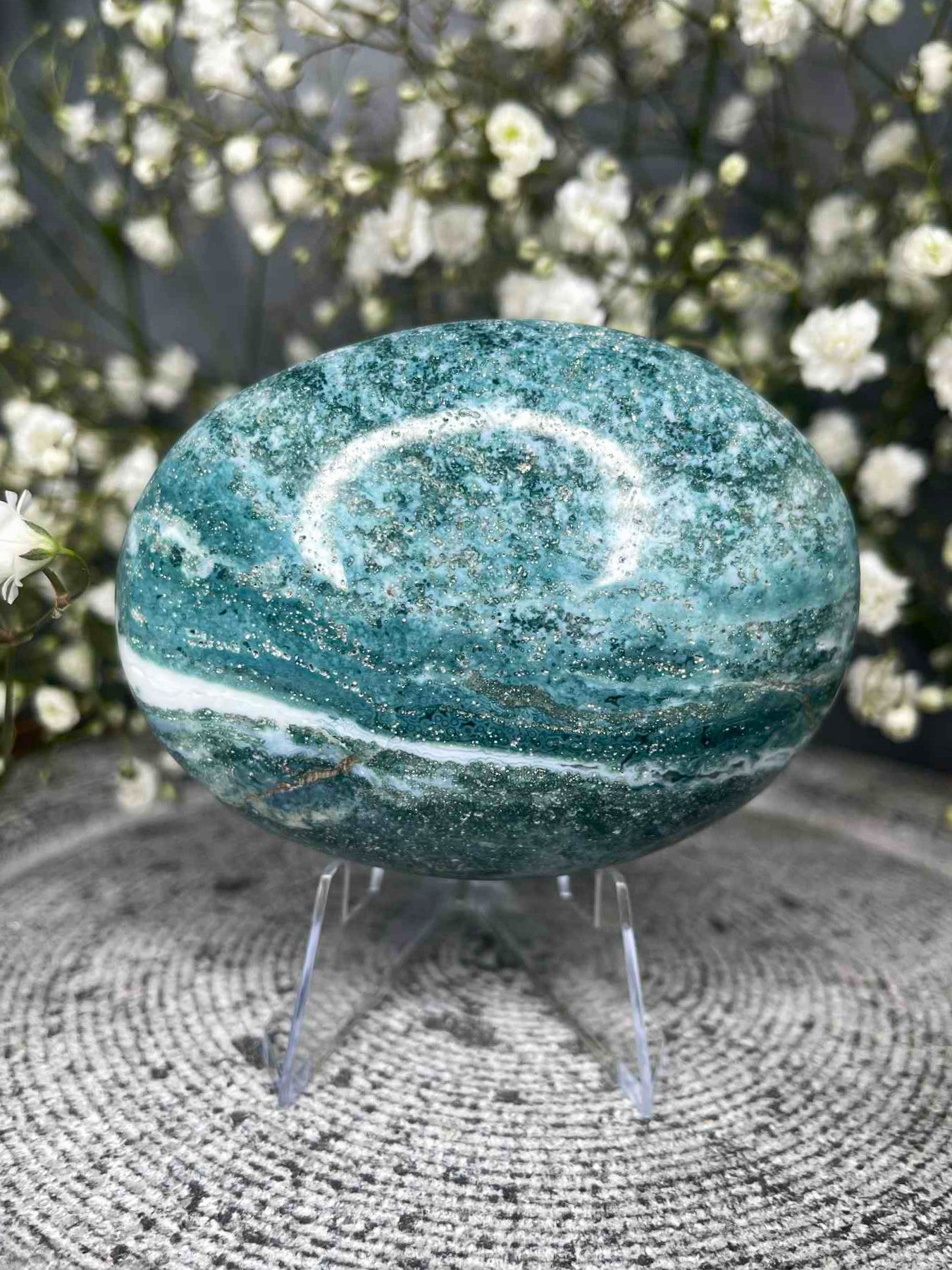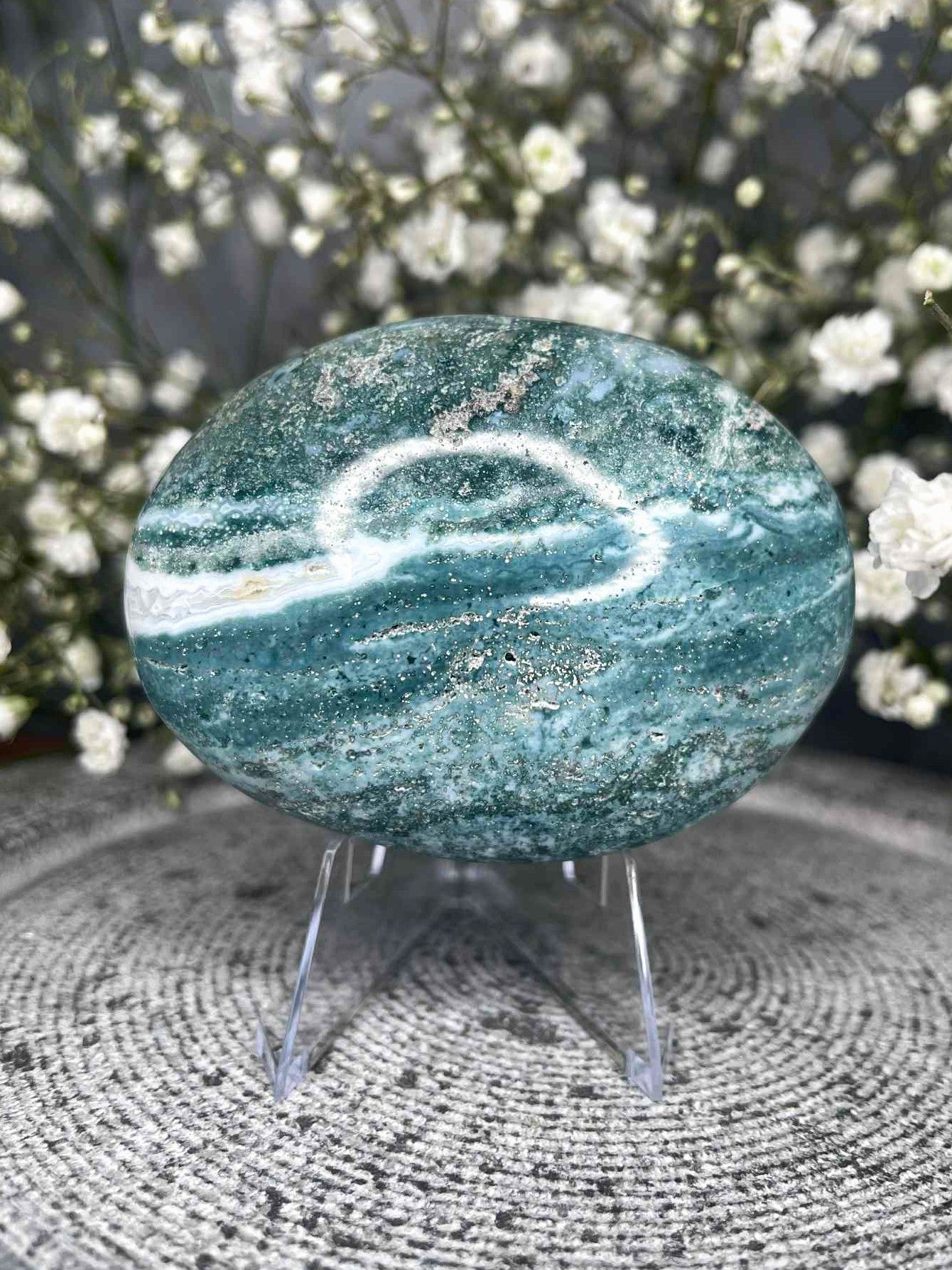 Immerse yourself in tranquility with this soothing Blue Ocean Jasper Palm Stone. Featuring soft, swirling shades of blue, resembling a serene seascape frozen in time. Its smooth, rounded shape fits perfectly in the palm, making it ideal for daily stress relief, meditation, or carrying on the go. The calming ocean-like patterns invite peace, patience, and emotional grounding.