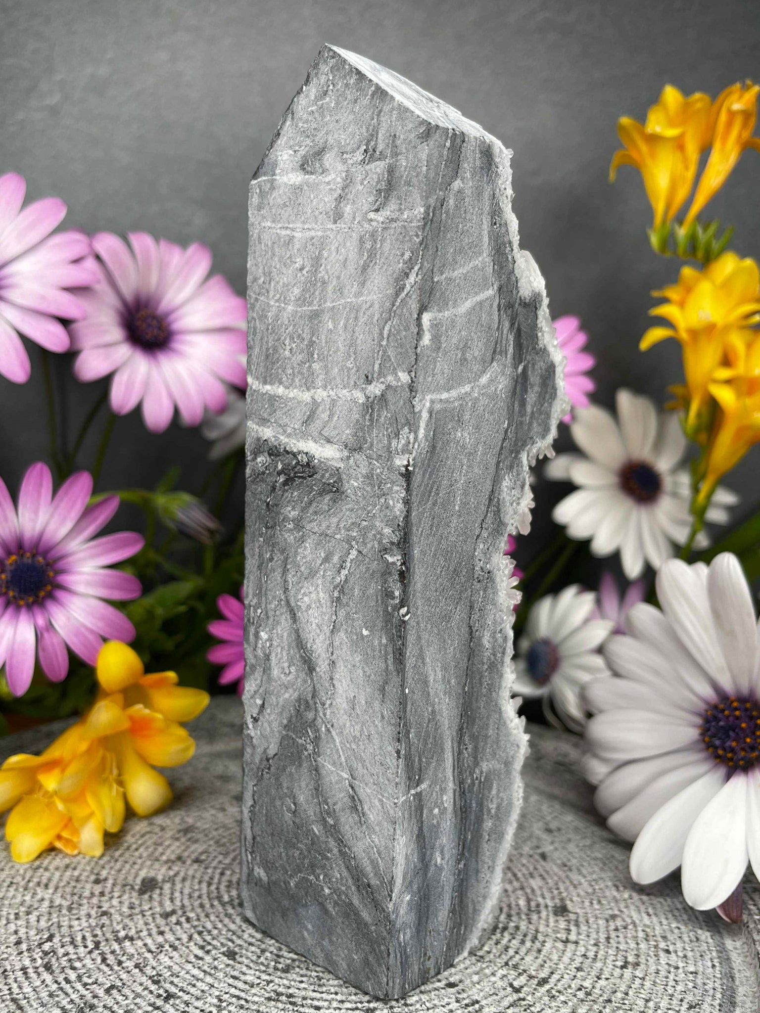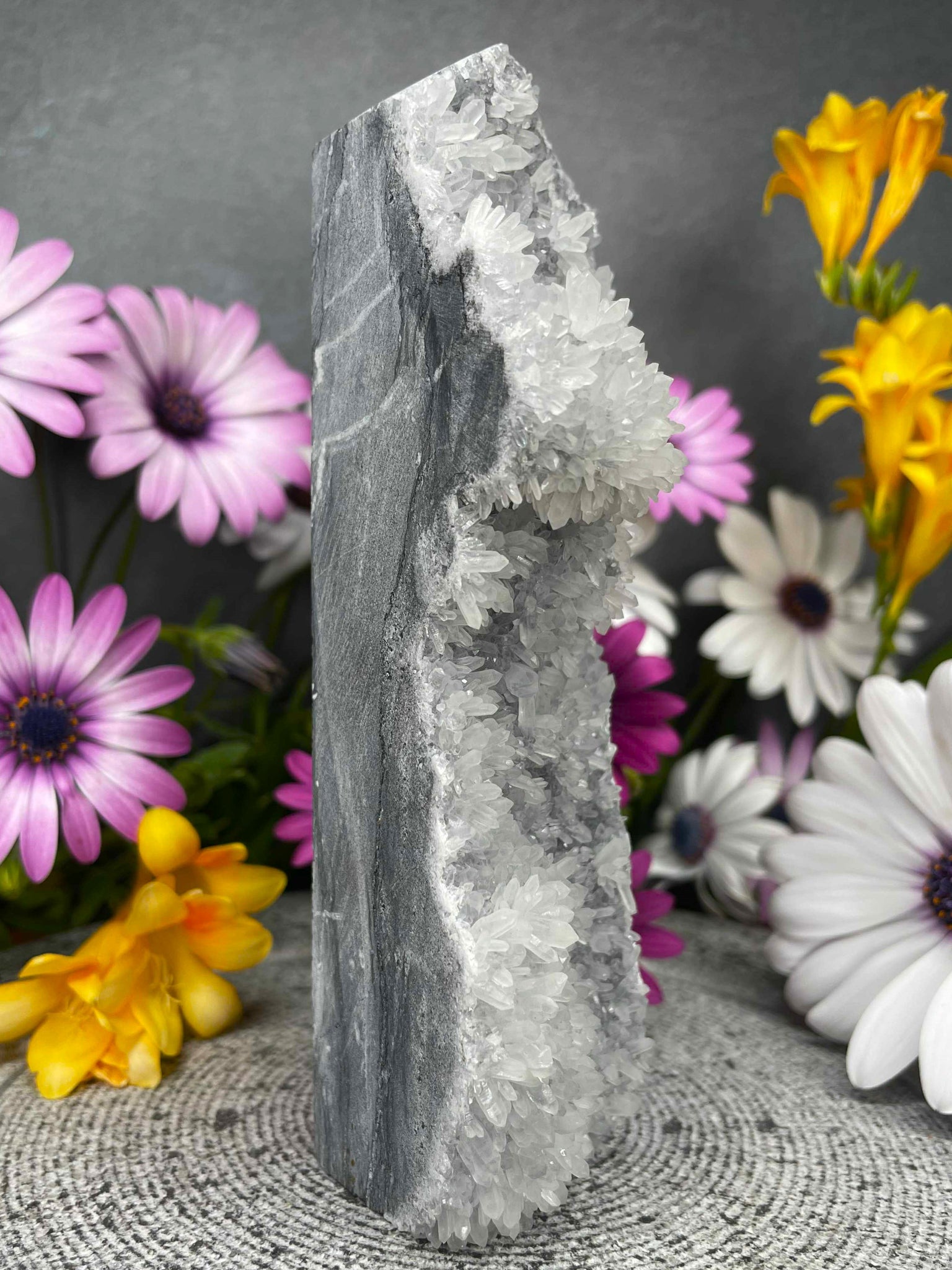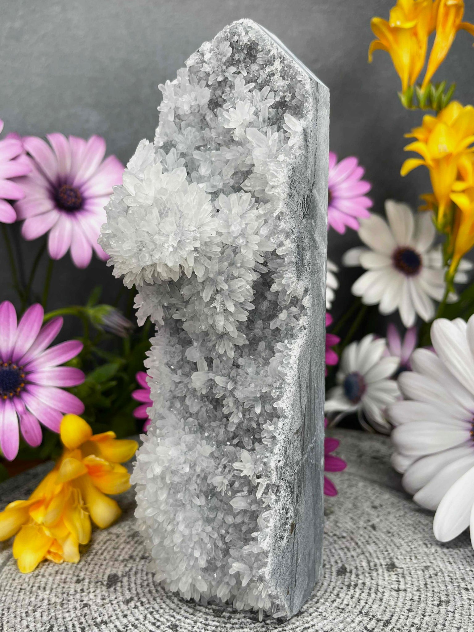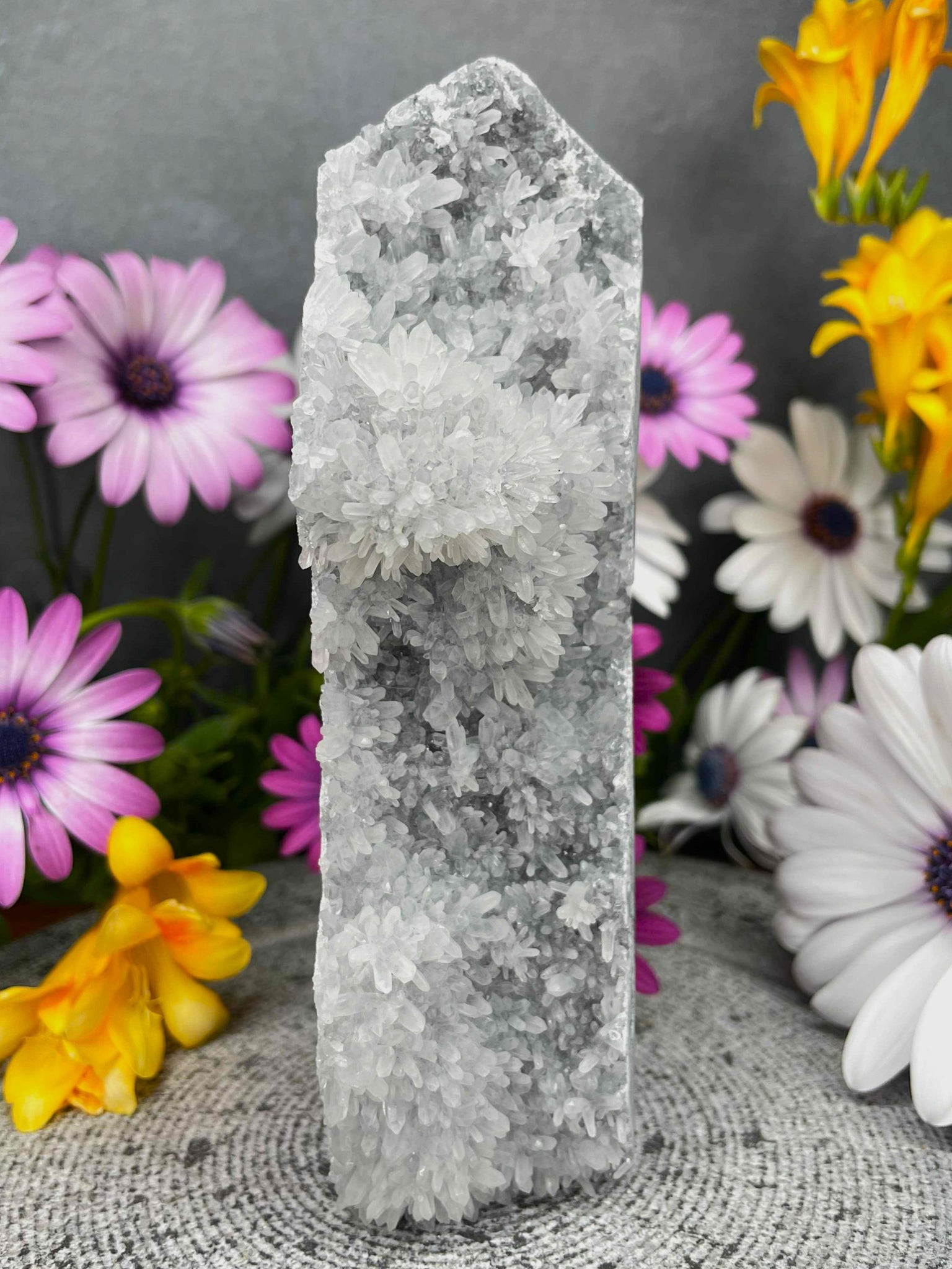 This Chrysanthemum Quartz Tower is a one-of-a-kind piece, showcasing stunning natural flower-like patterns that resemble delicate blossoms formed within the crystal. The front reveals its raw, clustered beauty, while the back has been carefully polished to highlight its unique structure and depth.