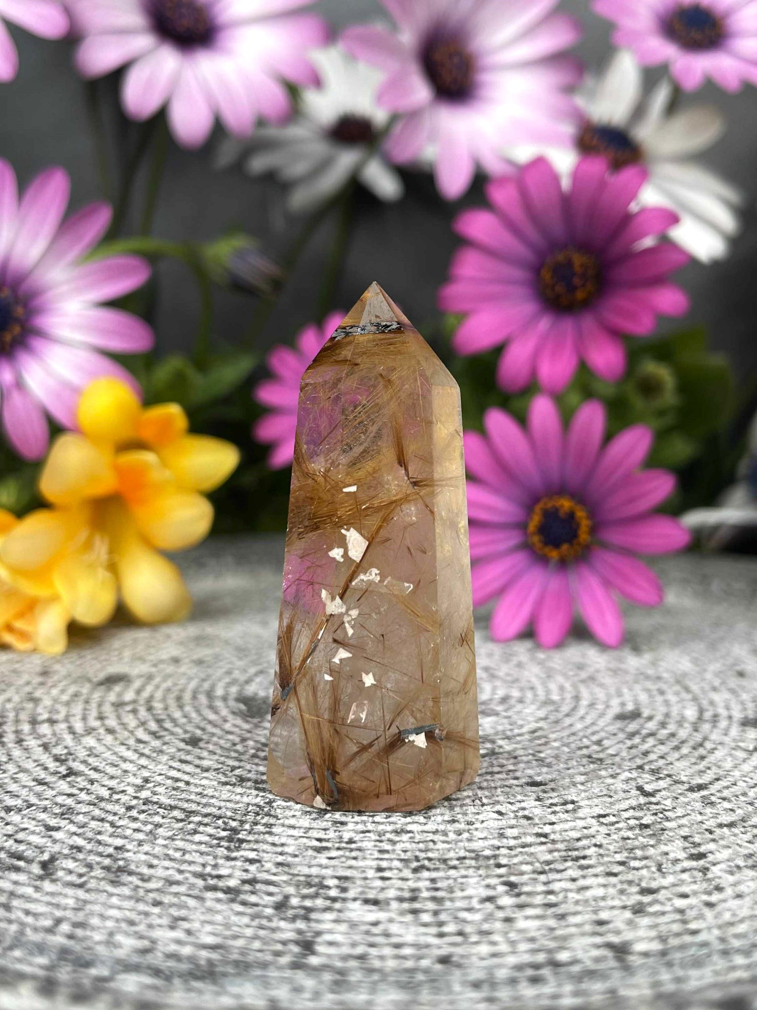 Rutile Quartz is celebrated as a stone of clarity, manifestation, and energy amplification. The golden inclusions are said to illuminate the mind, dissolve negativity, and inspire confidence and creativity. In tower form, it directs this energy upward, enhancing focus, uplifting the spirit, and creating a vibrant, harmonious atmosphere in any space.