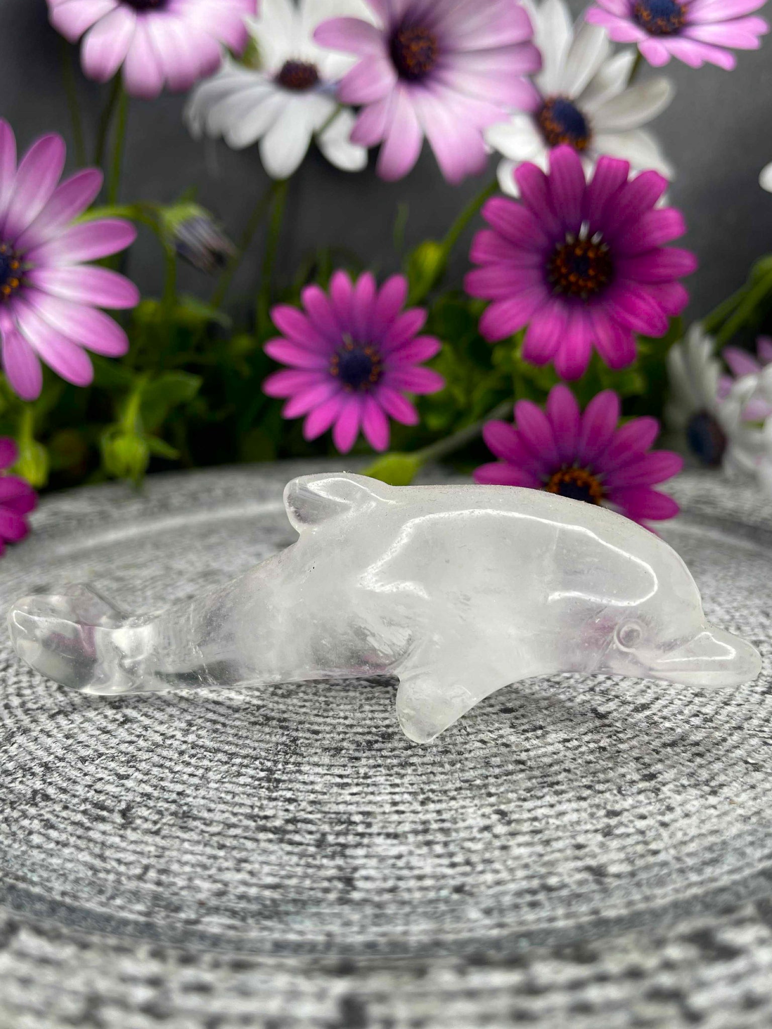 This beautiful clear quartz dolphin carving captures the grace and playfulness of the ocean’s most beloved creature. Expertly shaped and polished, it shimmers with brilliant clarity, reflecting light from every angle. The smooth, flowing dolphin design brings a sense of movement and joy, making it a truly eye-catching display piece.
