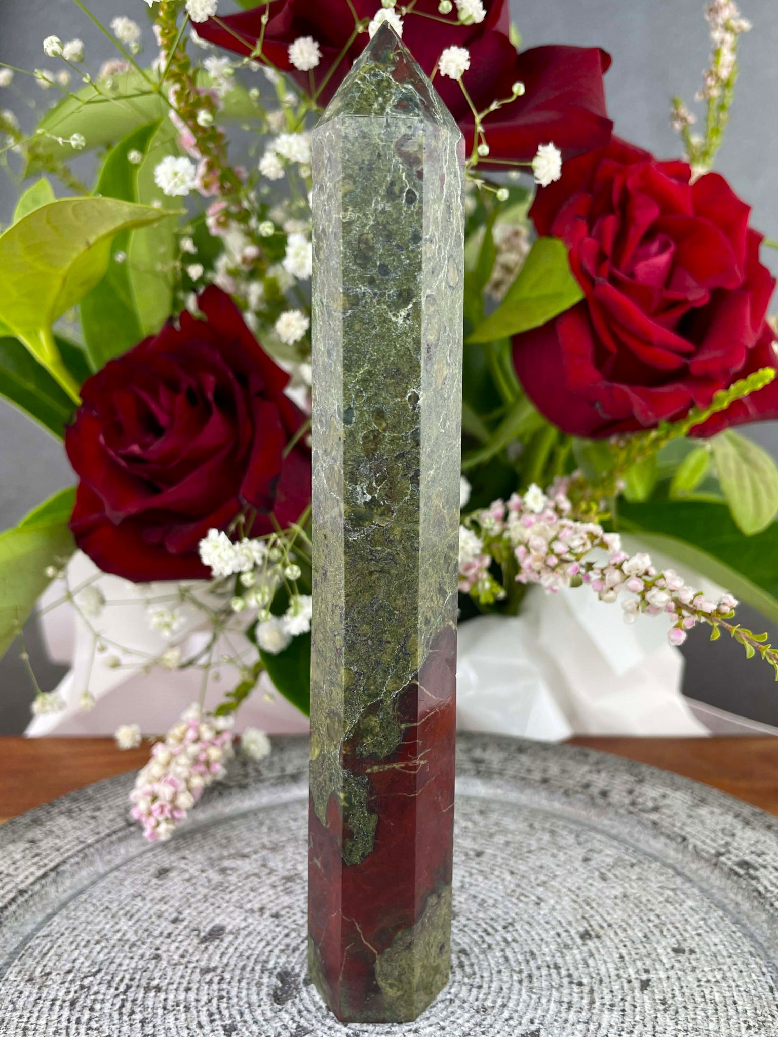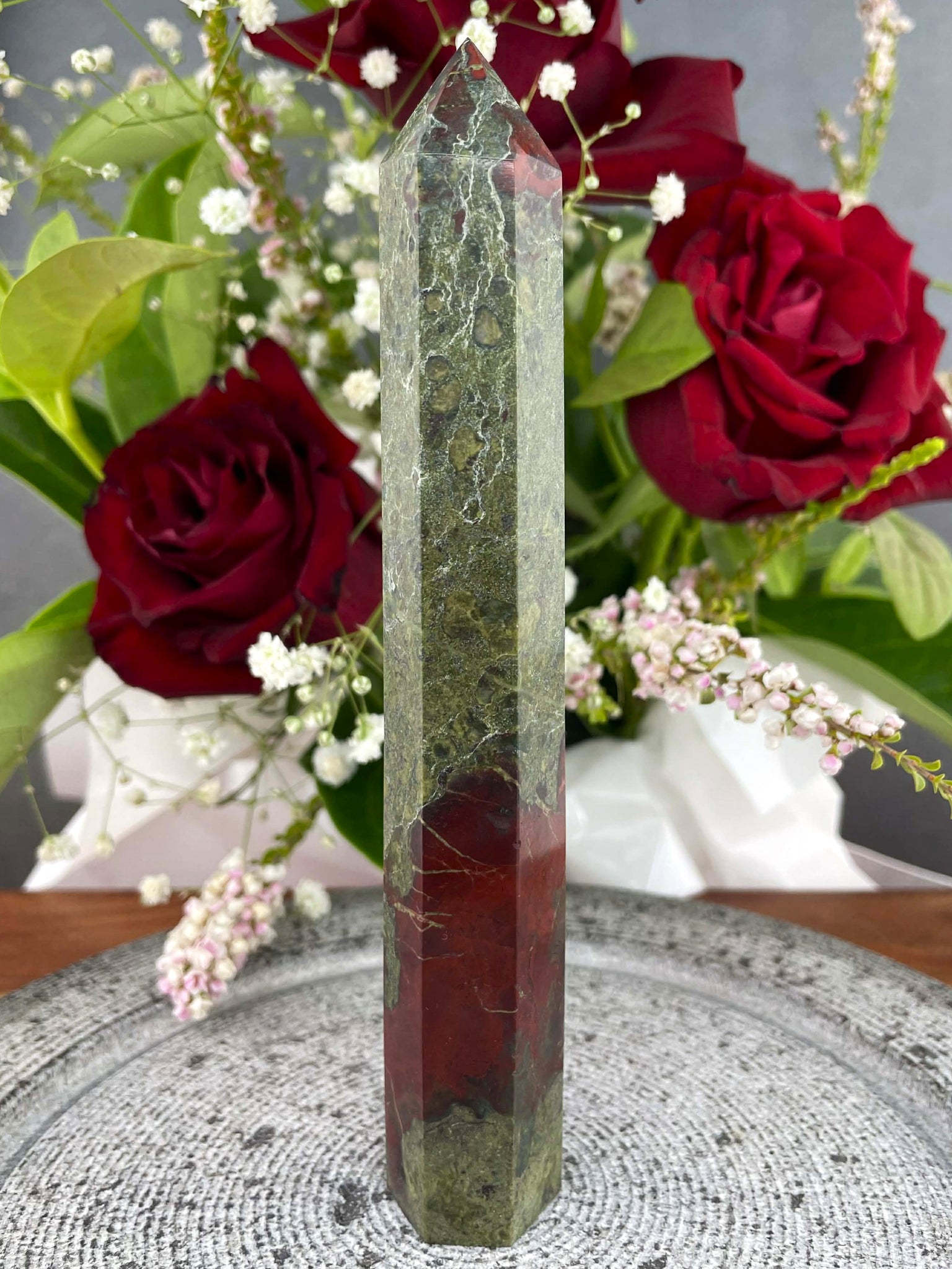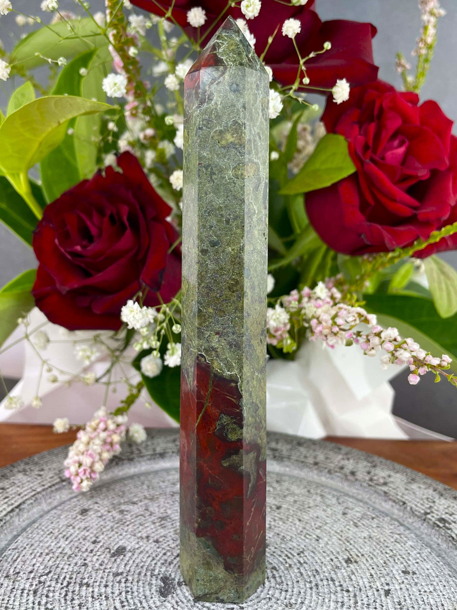 This striking Dragon Blood Jasper Tower Point features a bold blend of deep forest green and rich red tones, creating a powerful and earthy natural pattern throughout the stone. Expertly polished into a tower shape, the crystal highlights the dramatic colour contrasts and unique markings that make each piece truly one of a kind. Its pointed form draws the eye upward, making it a beautiful statement piece for a shelf, desk, altar, or crystal collection.