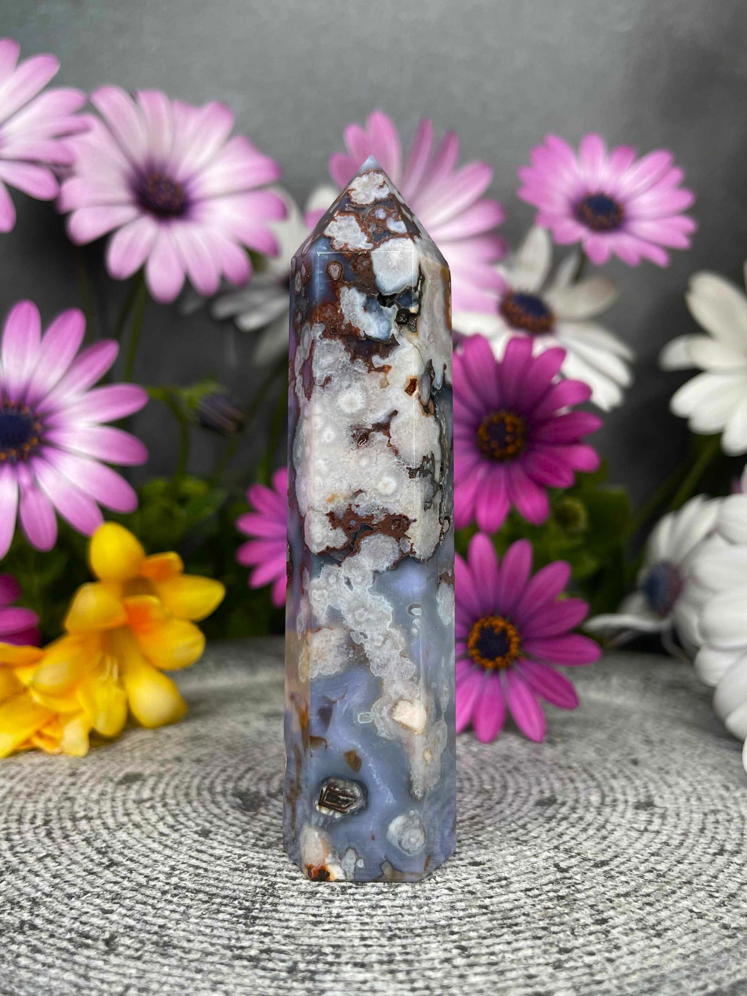 Introducing the Blue Flower Agate Crystal Tower—a stunning and unique piece designed to inspire peace and personal growth. With its soft blue tones and delicate flower-like inclusions, this tower is a beautiful reminder of nature’s gentleness and strength. The intricate patterns within this piece showcase the natural beauty of flower agate, capturing petal-like formations that evoke feelings of calm and introspection.