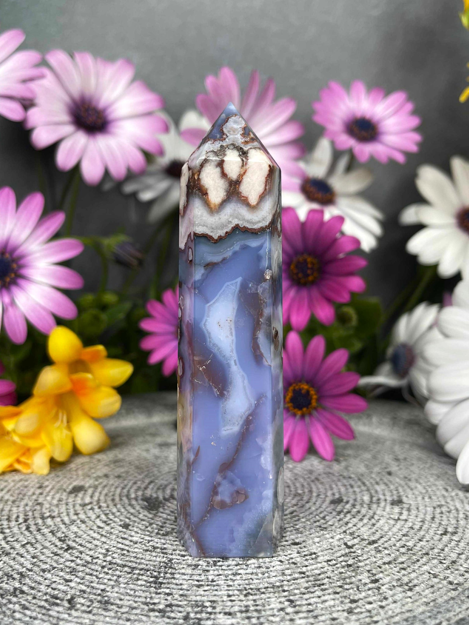 Known for its nurturing and heart-centered energy, blue flower agate is thought to encourage emotional healing, self-acceptance, and resilience. Perfect for enhancing meditation spaces, adding to a crystal collection, or as a thoughtful gift, this tower brings an aura of tranquility and positive energy to any space.