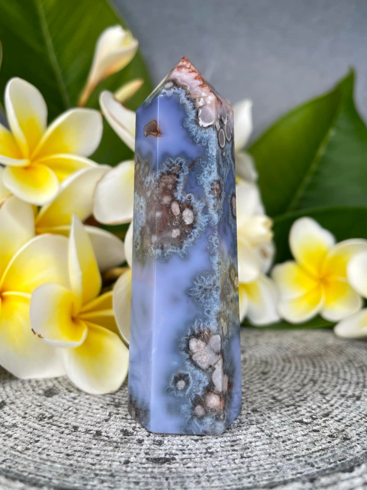 Introducing the Blue Flower Agate Crystal Tower—a stunning and unique piece designed to inspire peace and personal growth. With its soft blue tones and delicate flower-like inclusions, this tower is a beautiful reminder of nature’s gentleness and strength. The intricate patterns within this piece showcase the natural beauty of flower agate, capturing petal-like formations that evoke feelings of calm and introspection.