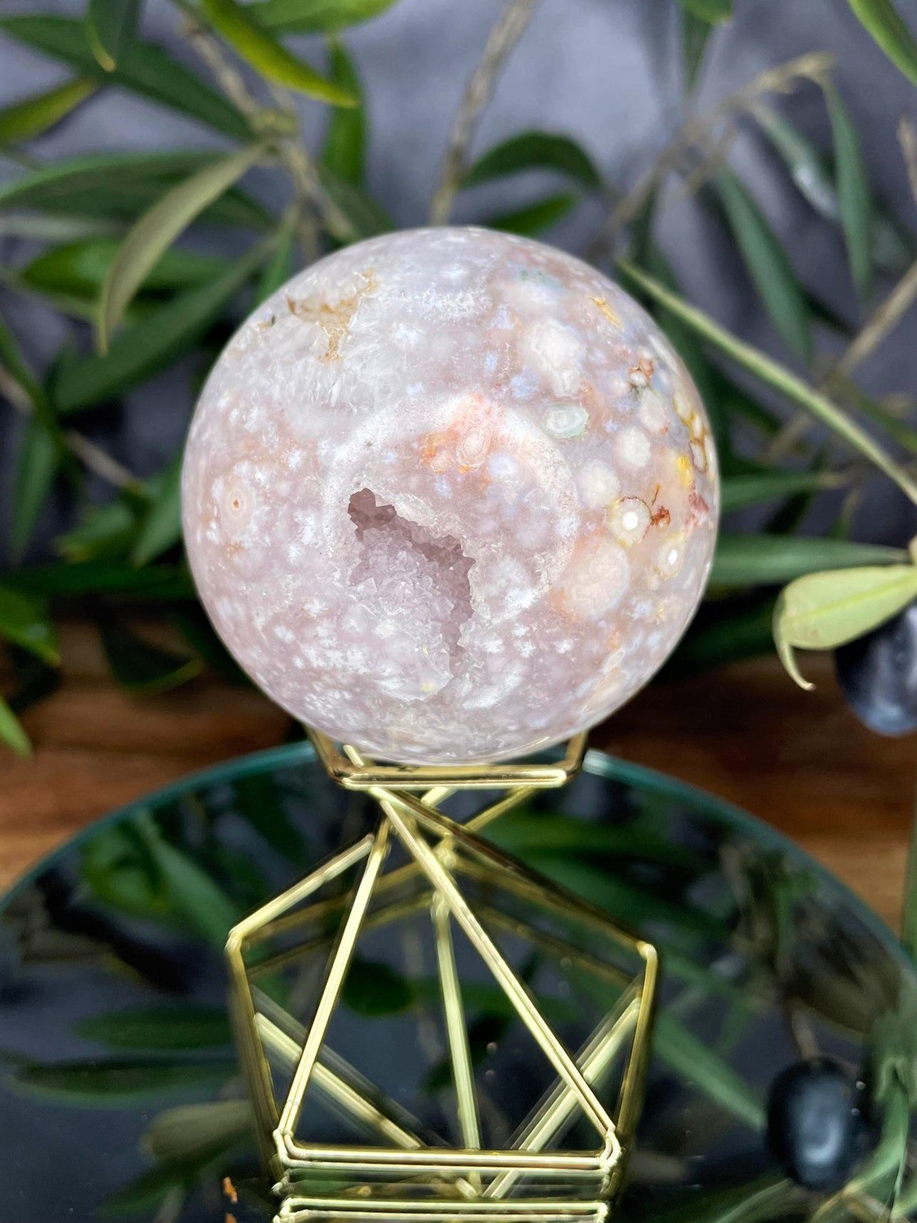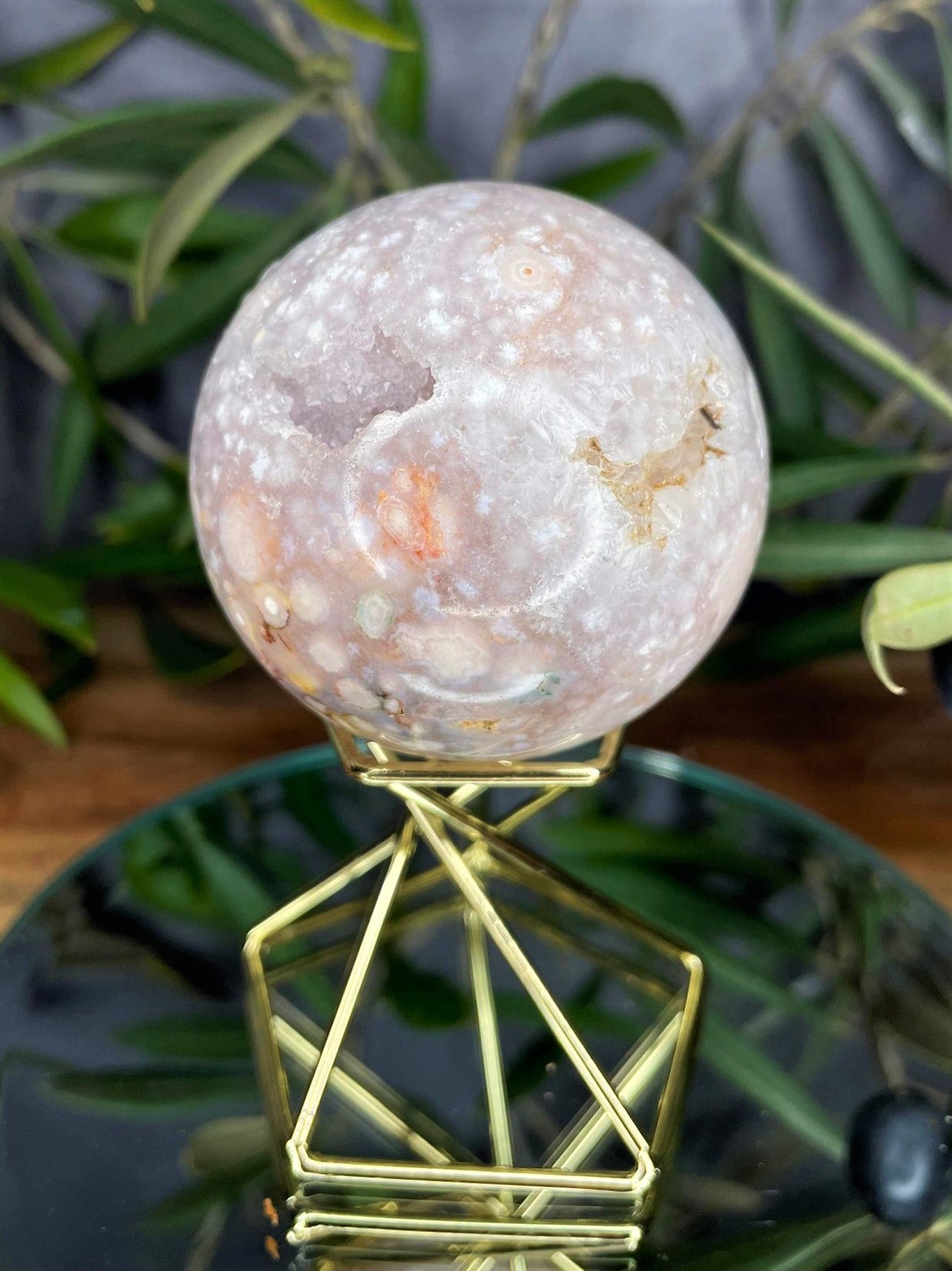Elevate your crystal collection with the exquisite Pink Amethyst Flower Agate Sphere, a harmonious blend of delicate pink amethyst and captivating flower agate. This spherical masterpiece captivates the senses with its enchanting beauty, showcasing soft pink hues that evoke feelings of serenity and grace. The intricate formations within the flower agate resemble blossoming petals, creating a mesmerizing dance of nature's artistry.