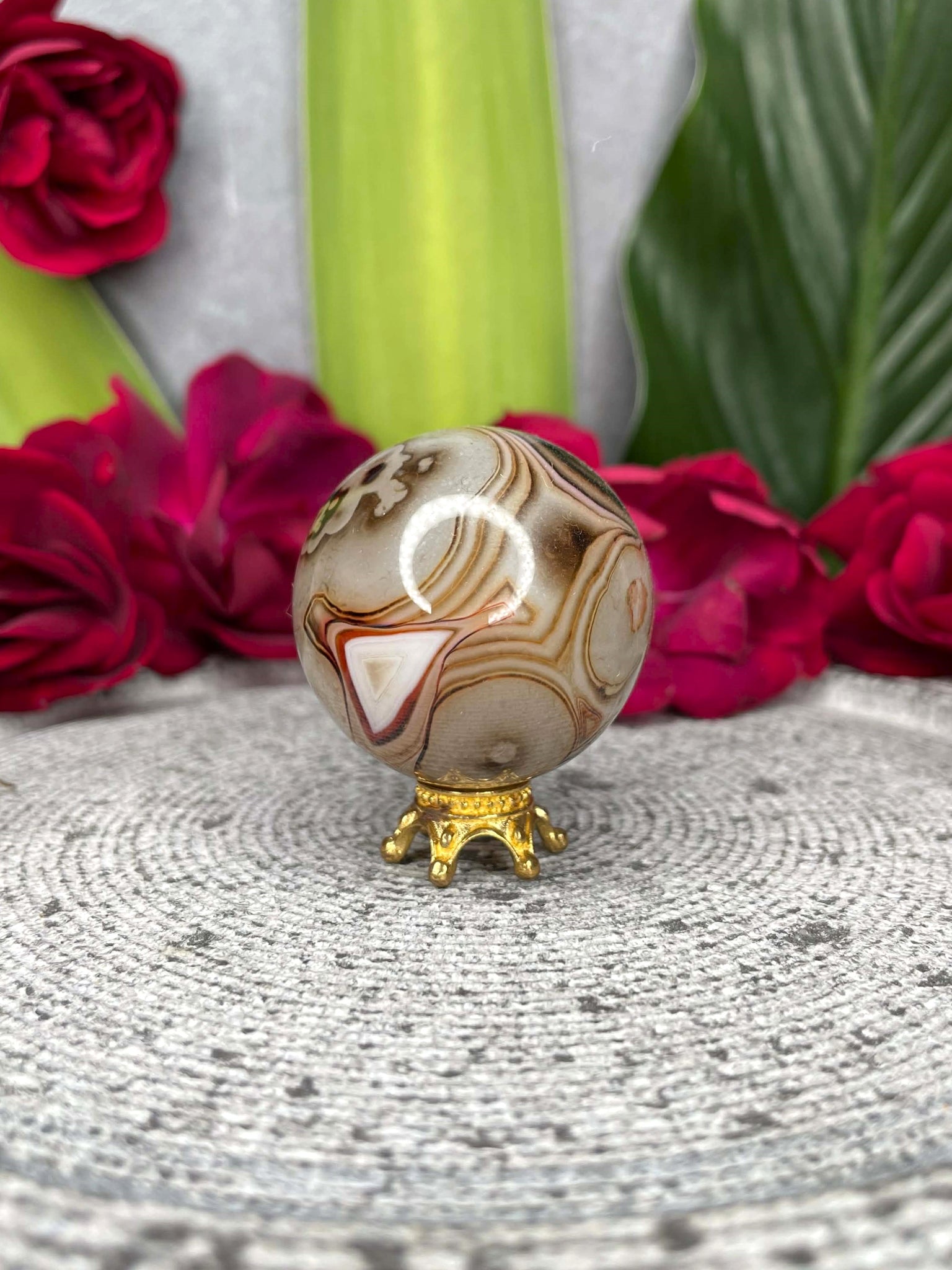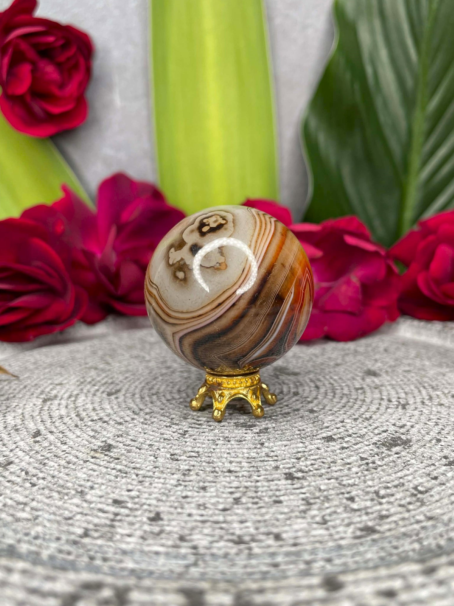 This sardonyx crystal sphere features striking natural bands of warm red, caramel and earthy brown layered with creamy white and deep onyx tones, polished into a smooth, glossy orb that highlights the stone’s unique patterns from every angle. Each sphere is one-of-a-kind, making it a beautiful statement piece for your home, workspace or altar, while the spherical shape allows the stone’s energy and presence to flow evenly throughout a space.