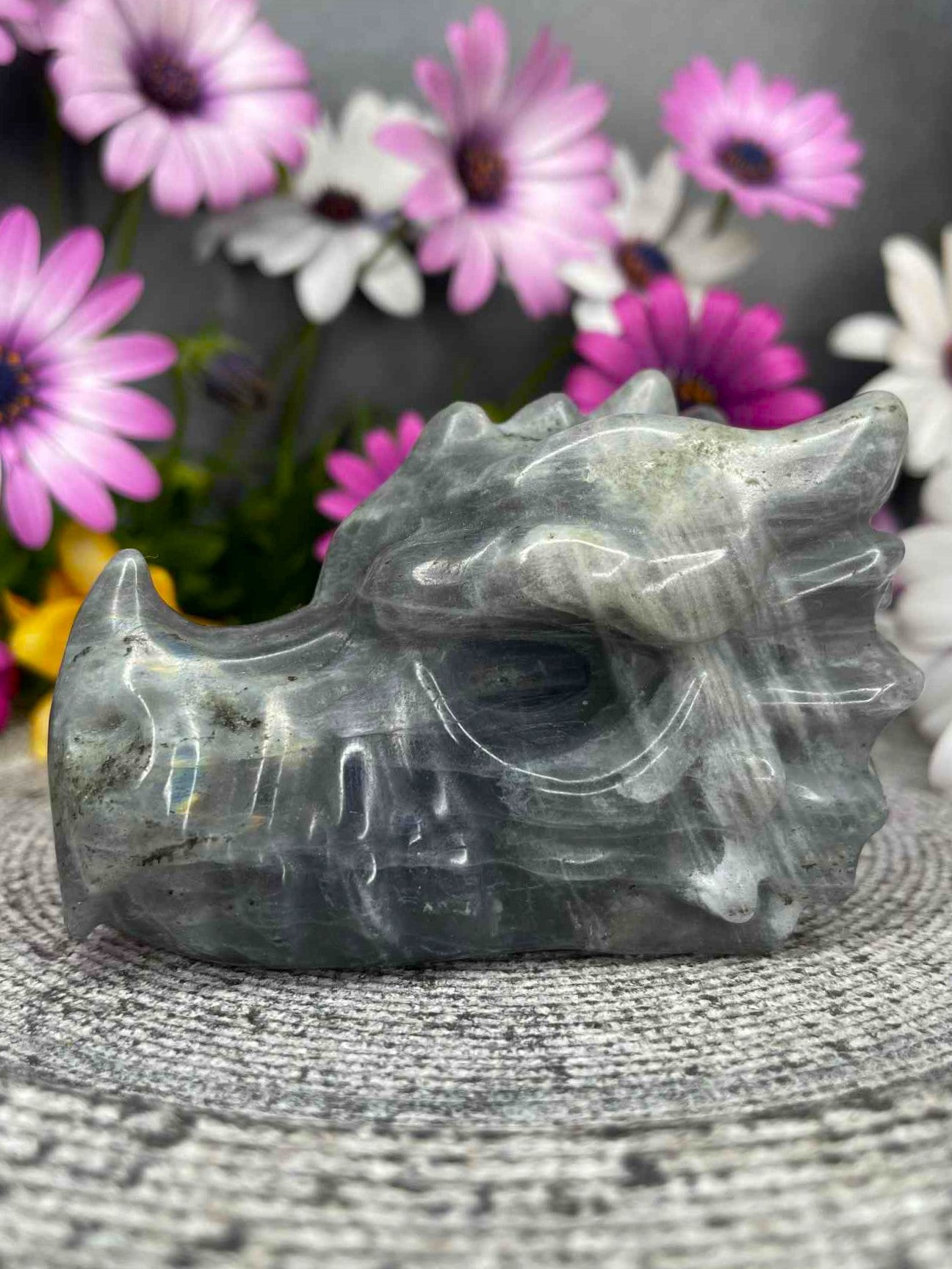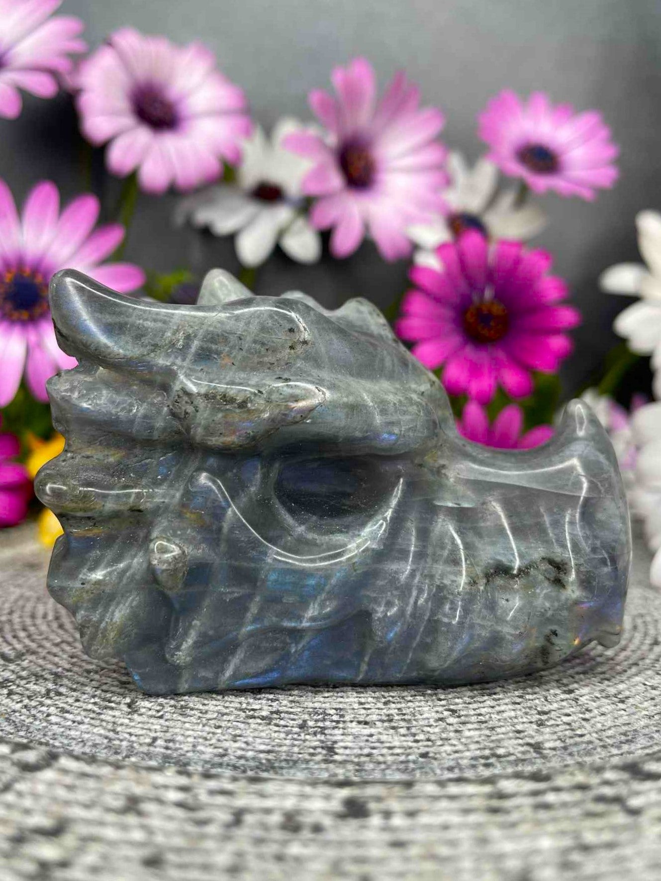 Labradorite is celebrated for its protective and transformative energies, enhancing intuition and grounding the spirit. This dragon head carving is perfect for those who appreciate both artistry and metaphysical beauty, making it a unique centerpiece for meditation spaces, altars, or crystal displays. A true treasure for collectors, it combines natural wonder with masterful craftsmanship.