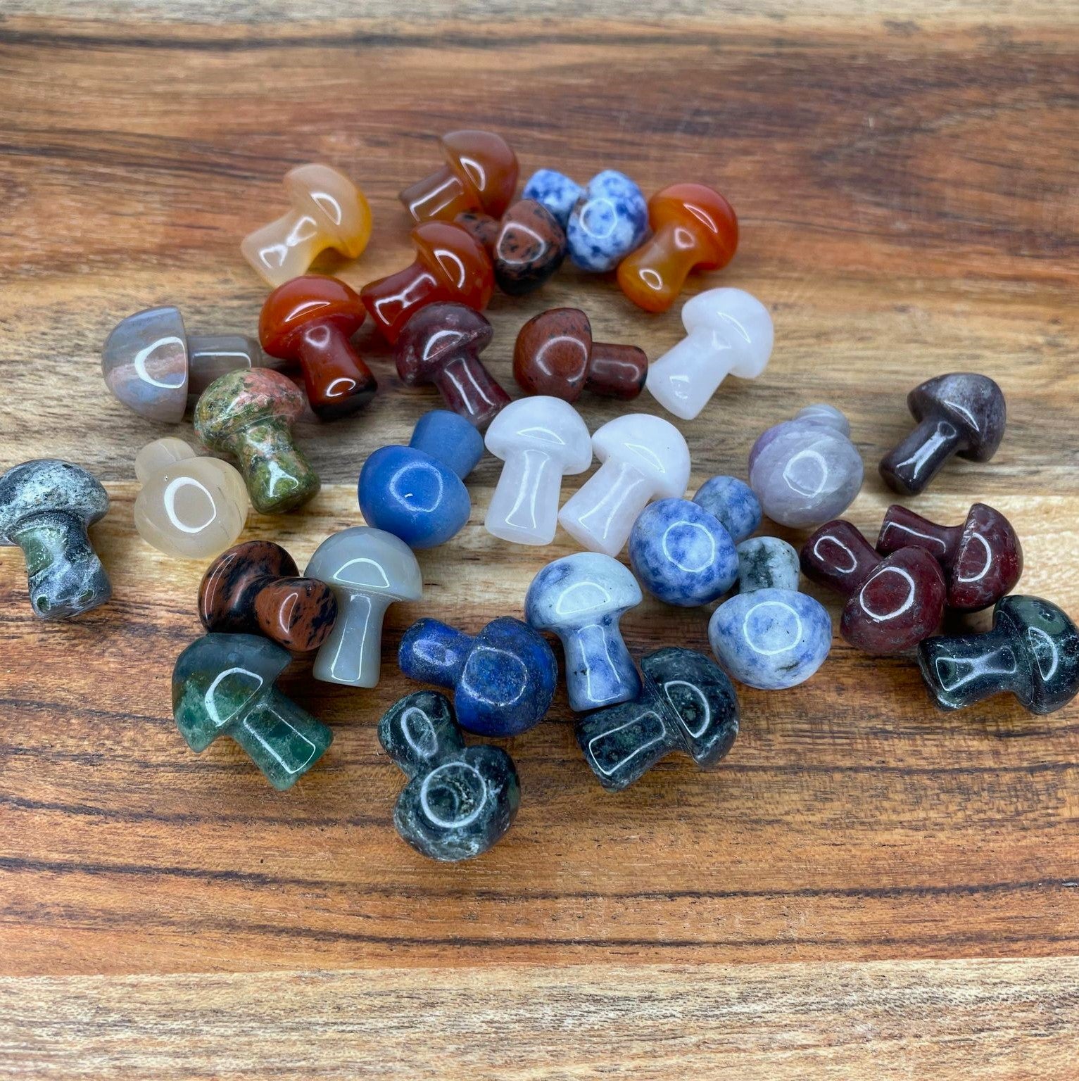 The mushroom shape itself is a good luck symbol and may bring forth clarity, aiding in an opened crown chakra. Use multiples in a crystal grid or altar set up. Size: 1cmColors are chosen at random.