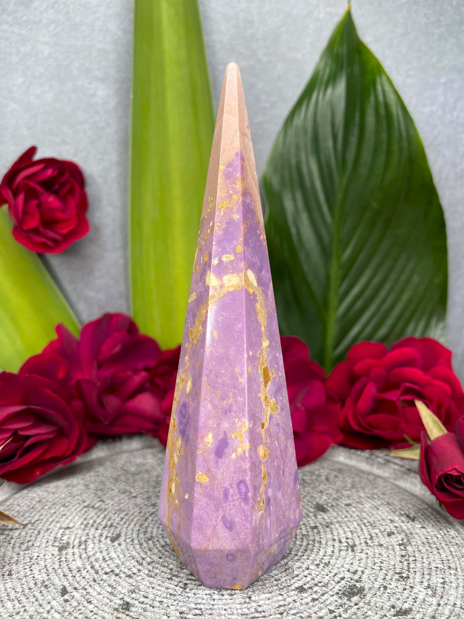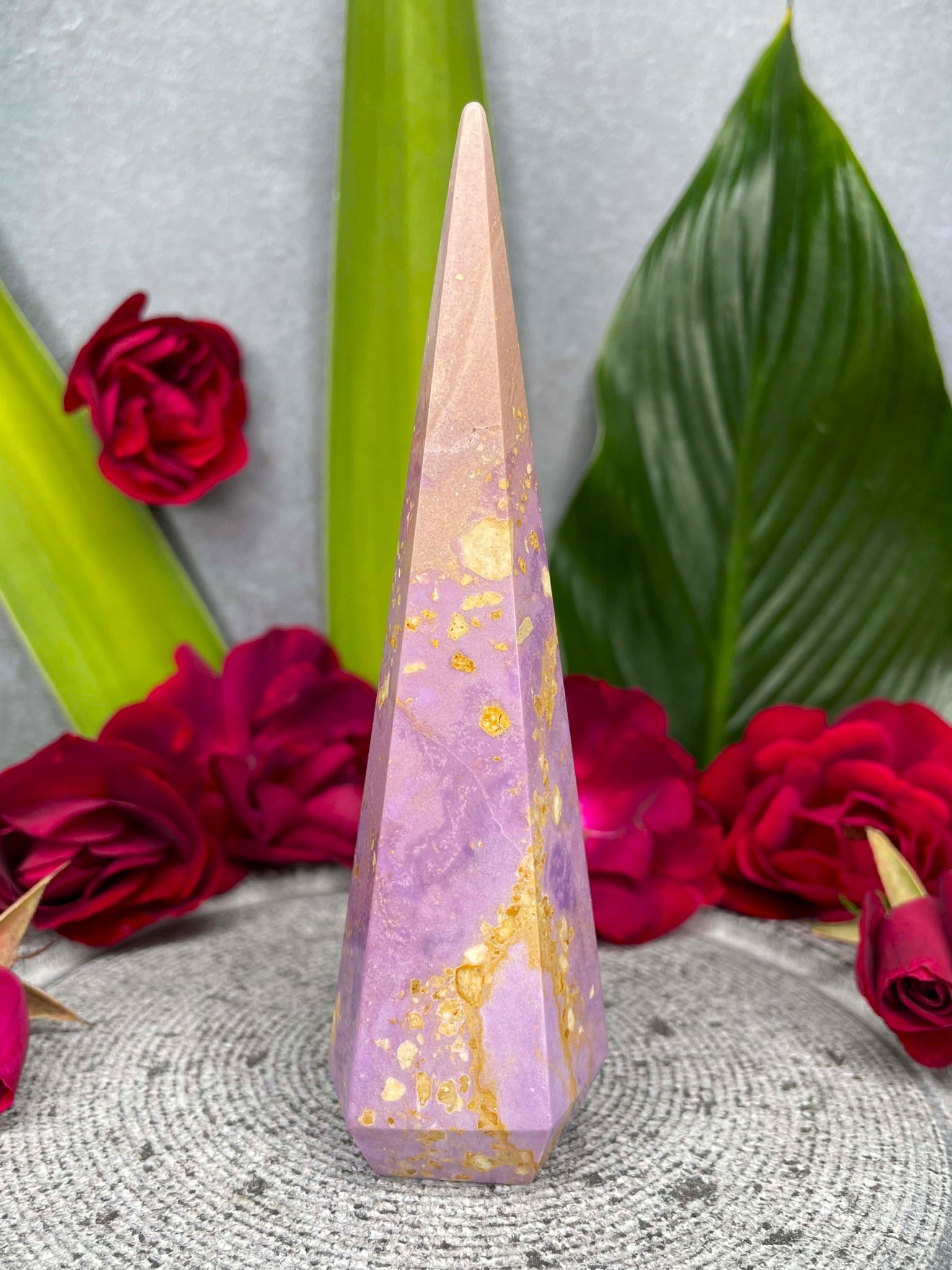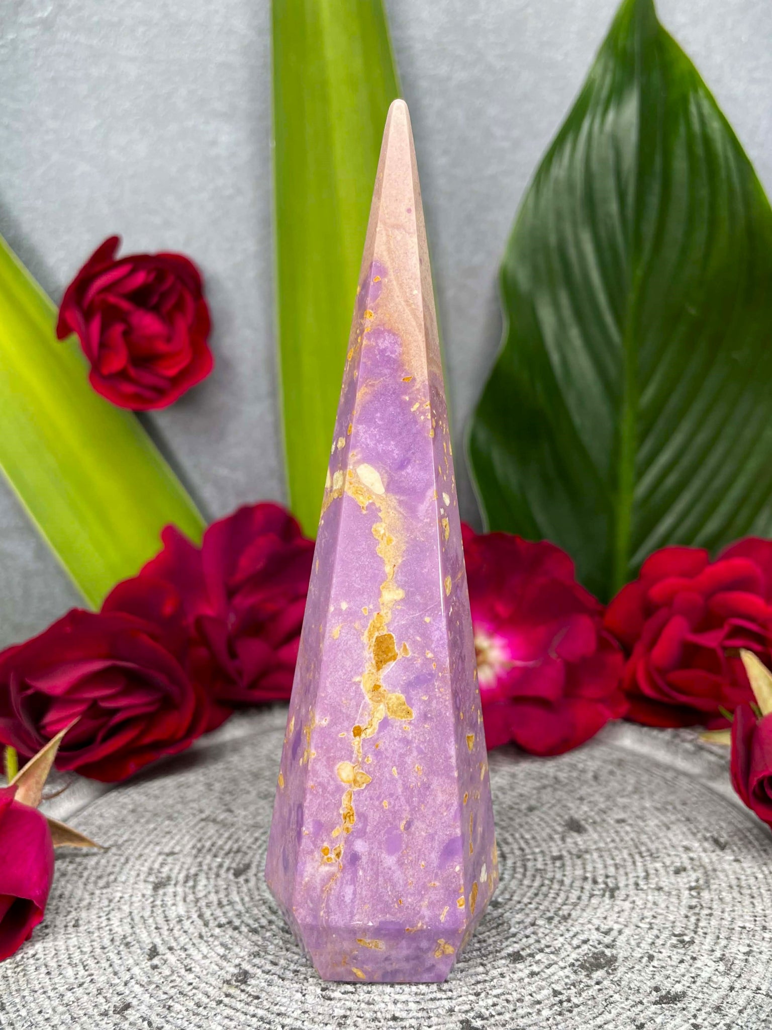 This beautiful Crystal Diamond Tower is crafted from natural Phosphosiderite, showcasing soft lavender to pinkish-purple hues with gentle marbling and a smooth, polished finish. The elegant diamond-cut shape enhances the stone’s calming colour tones and refined appearance.