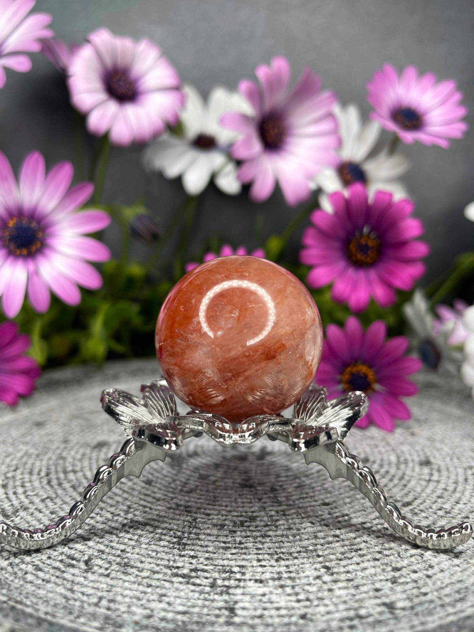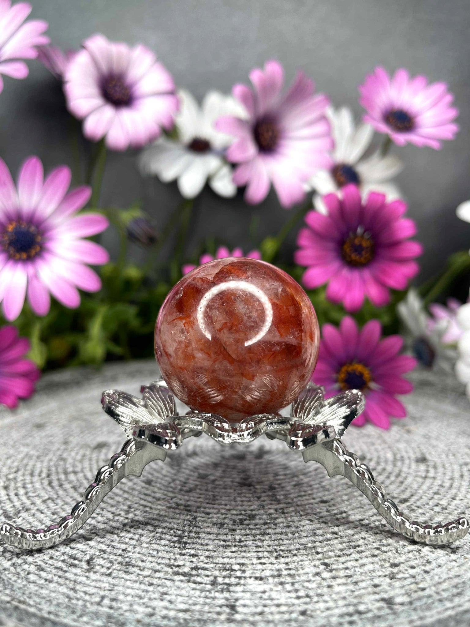 This beautiful fire quartz (hematoid) crystal sphere features warm, fiery inclusions of red and orange hematite dancing within clear quartz. Its smooth, polished surface highlights the natural veining and depth of color, creating a stunning visual effect that catches the light from every angle. Compact and elegant, it’s the perfect size for display, energy work, or carrying in your space.