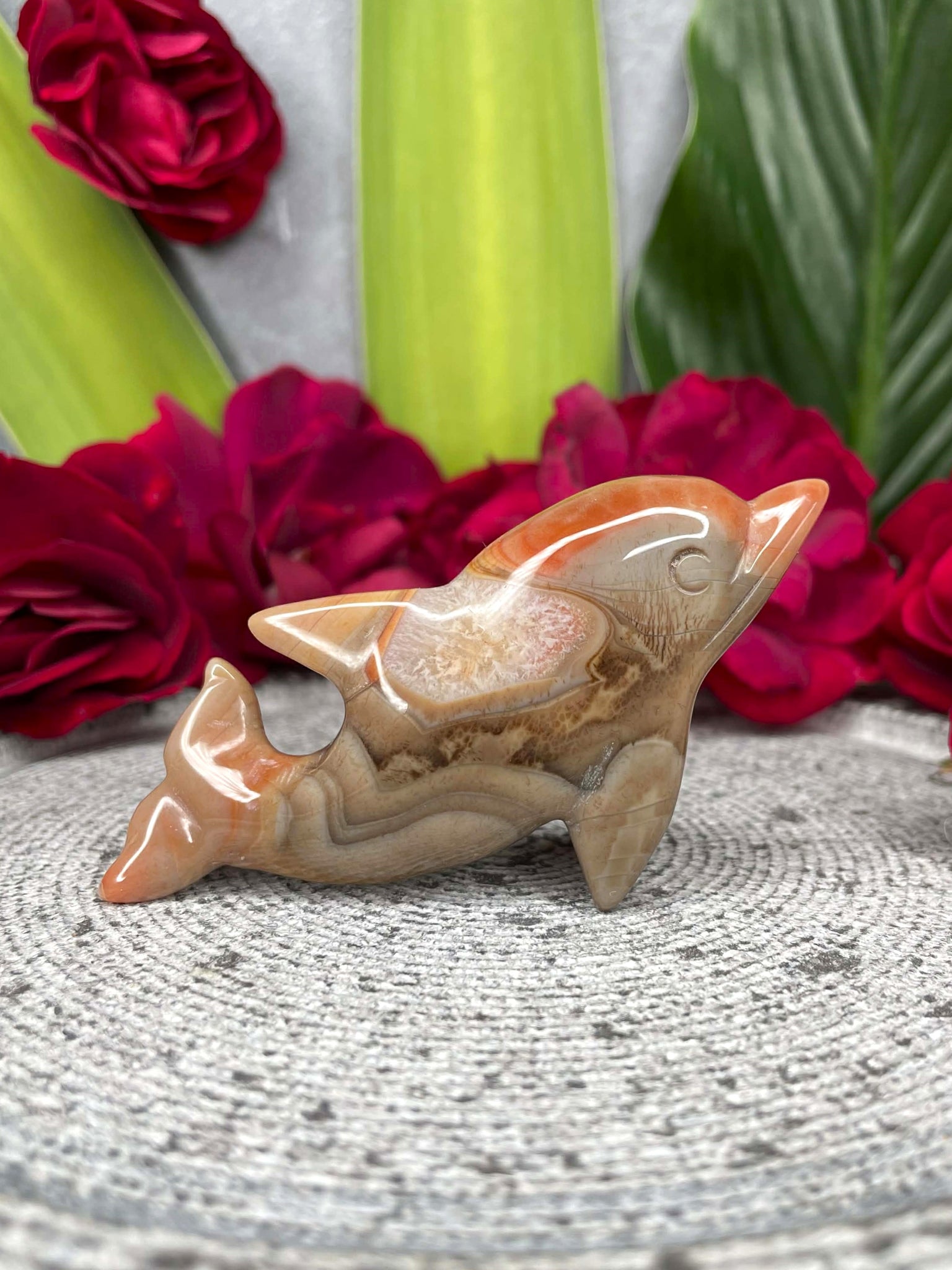 This stunning Dolphin carving is crafted from natural Red Agate and Quartz, showcasing rich red tones, flowing agate banding, and clear quartz crystal details that enhance the dolphin’s elegant, fluid form. The contrast between warm colour and luminous clarity creates a striking and balanced piece.