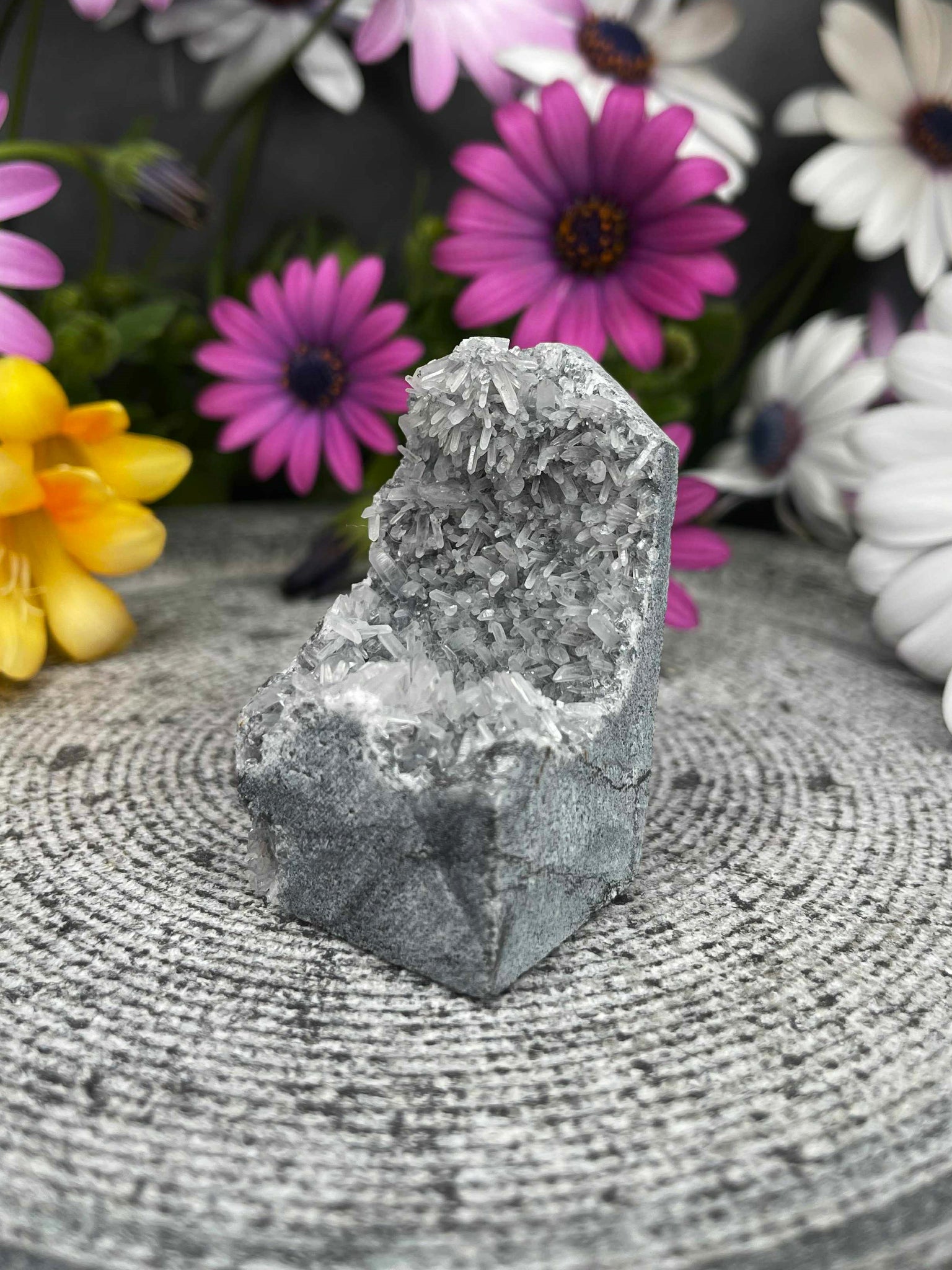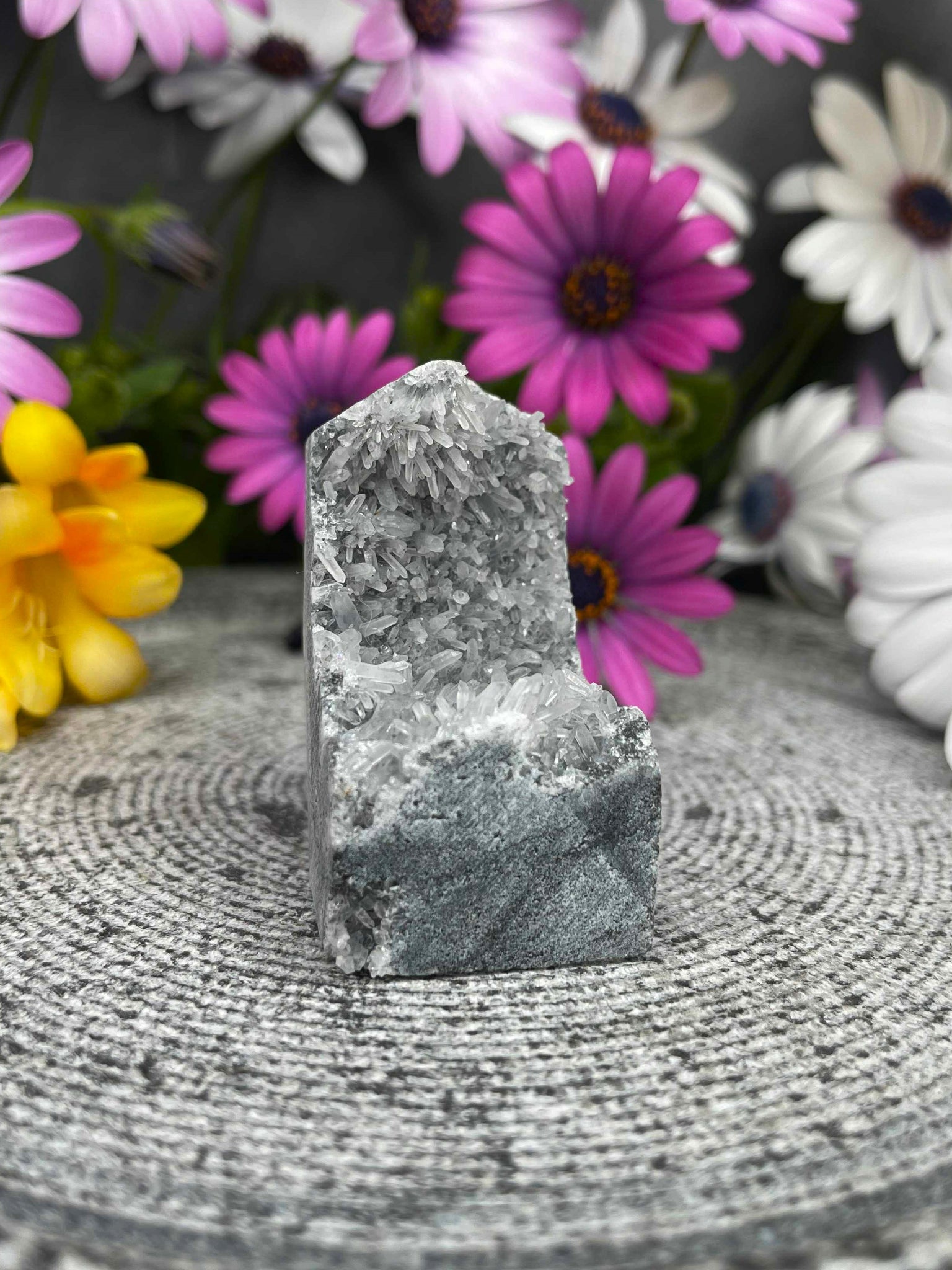 This Chrysanthemum Quartz Tower is a one-of-a-kind piece, showcasing stunning natural flower-like patterns that resemble delicate blossoms formed within the crystal. The front reveals its raw, clustered beauty, while the back has been carefully polished to highlight its unique structure and depth.