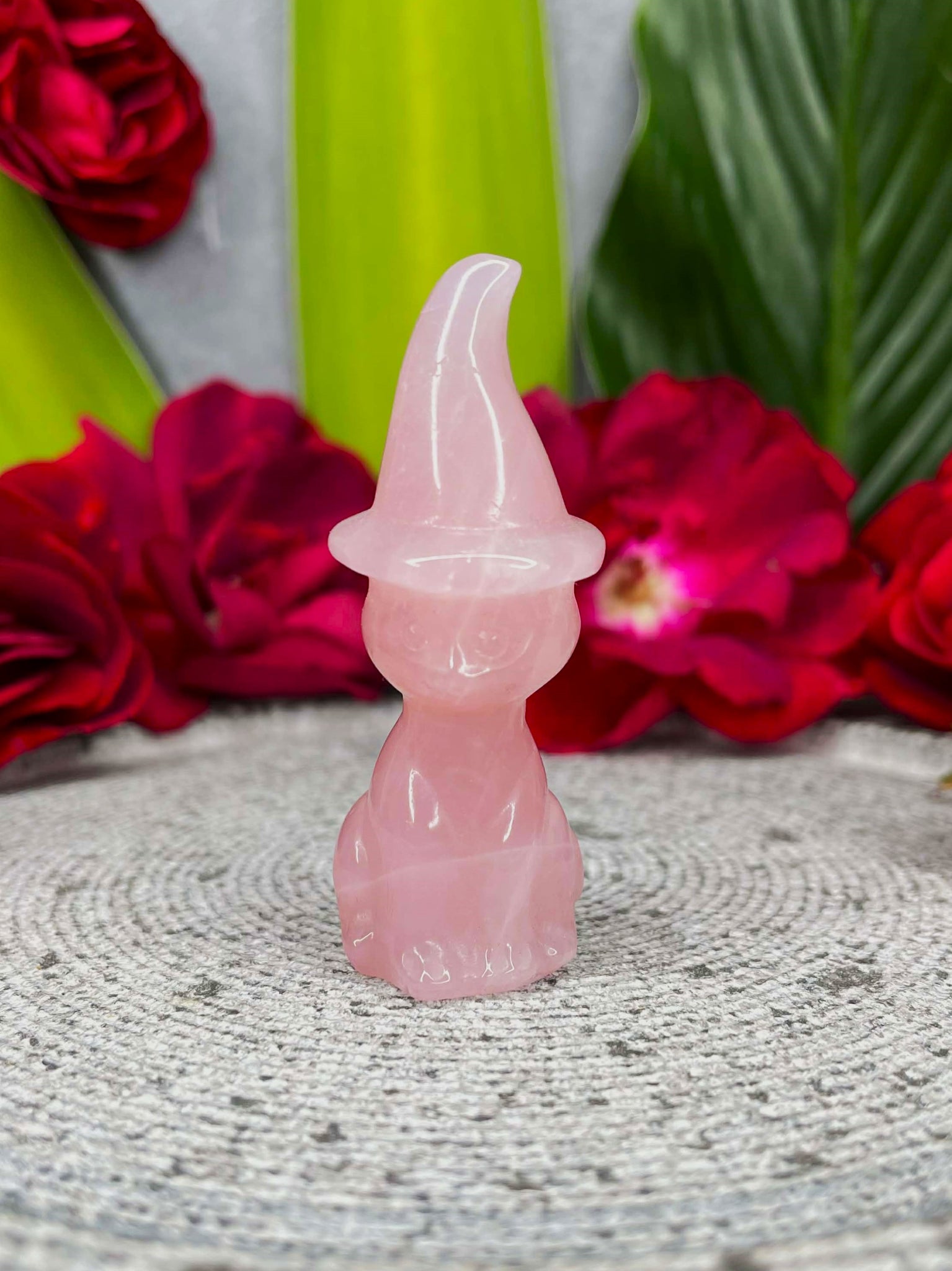 This charming Cat with Witch Hat carving is lovingly crafted from natural Rose Quartz, featuring soft blush-pink hues and a smooth, polished finish that enhances its whimsical design. The delicate colouring and gentle translucence of the crystal beautifully highlight the cat’s playful yet mystical character.