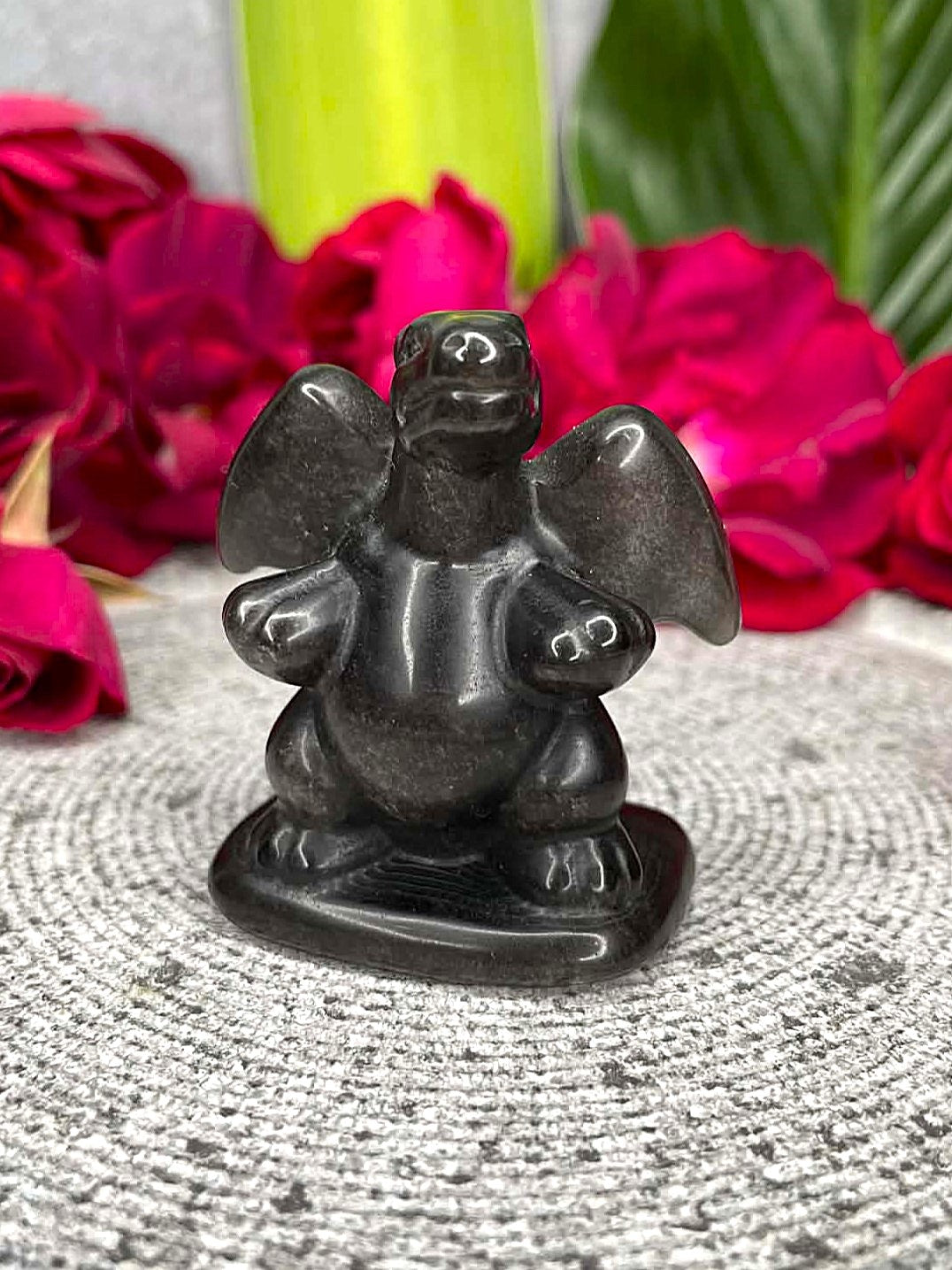 Silver Sheen Obsidian is known for its grounding and protective energy. It is believed to help deflect negativity, strengthen personal boundaries, and support clarity and inner strength. Combined with Charizard’s symbolism of confidence, power and transformation, this carving makes a meaningful companion for both crystal lovers and Pokémon fans.