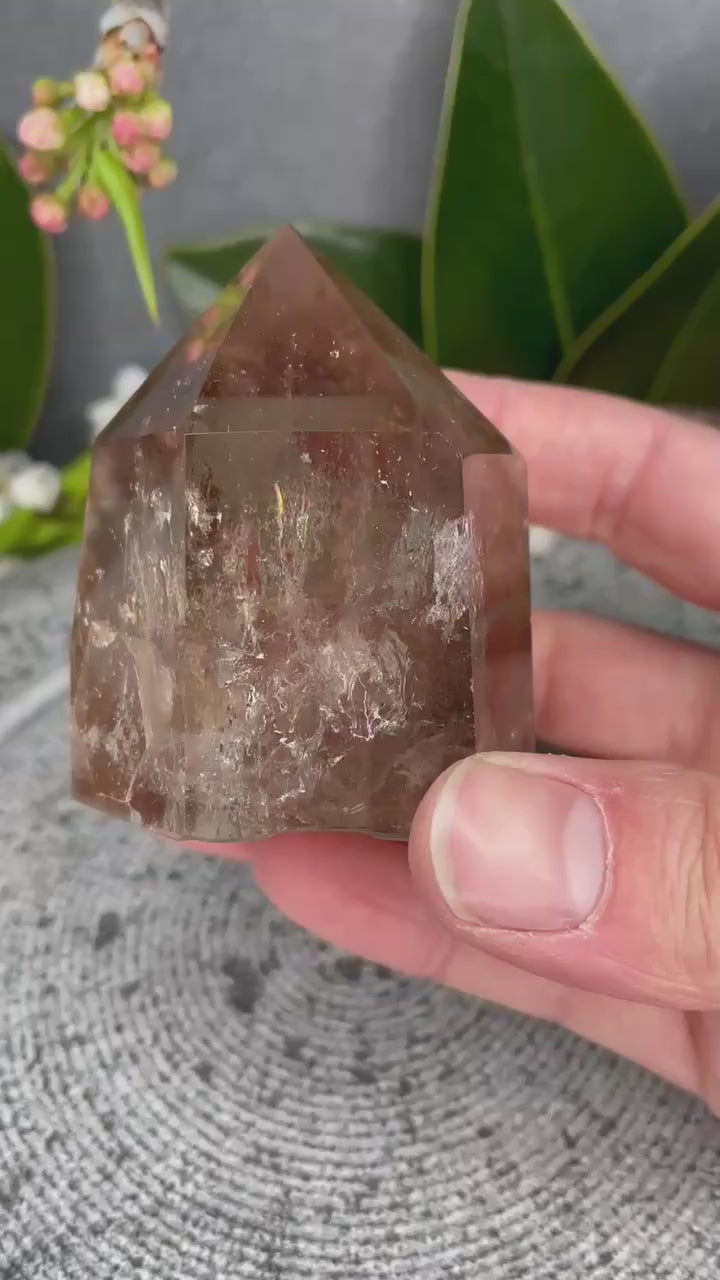 This Smoky Quartz Tower is a striking piece of natural beauty, filled with grounding energy and flashes of magical rainbows that catch the light. Its smoky tones create a calming presence, while the polished point shape enhances its ability to focus and amplify energy. The rainbows inside bring a joyful and uplifting vibration, making this tower both powerful and visually enchanting.