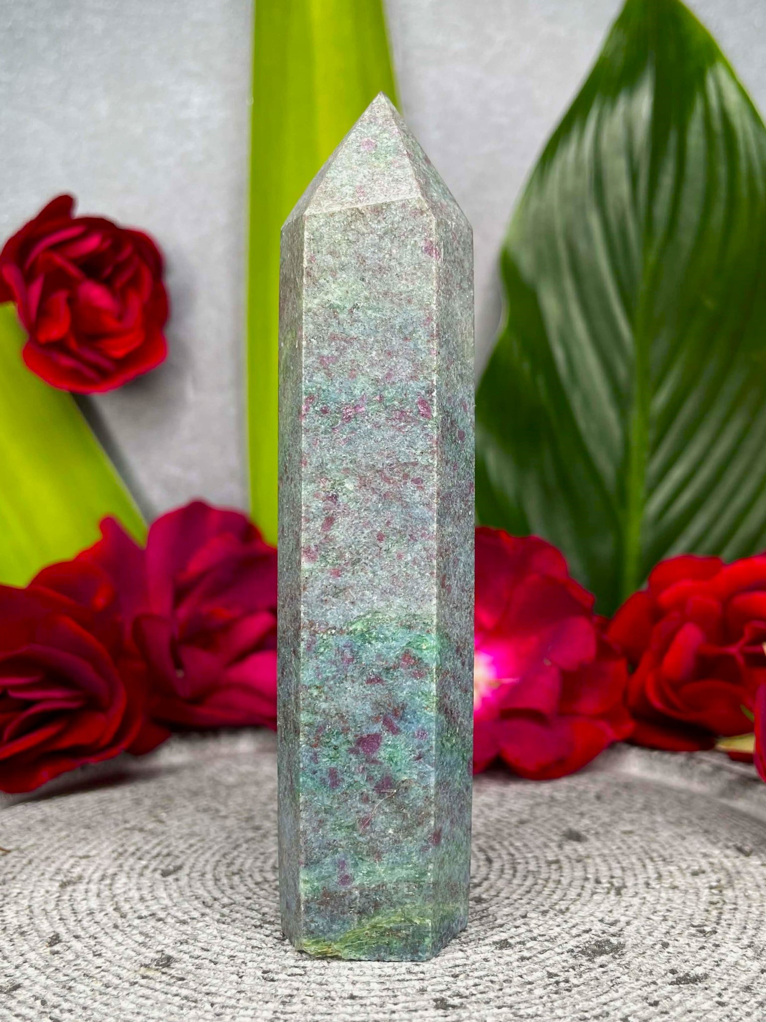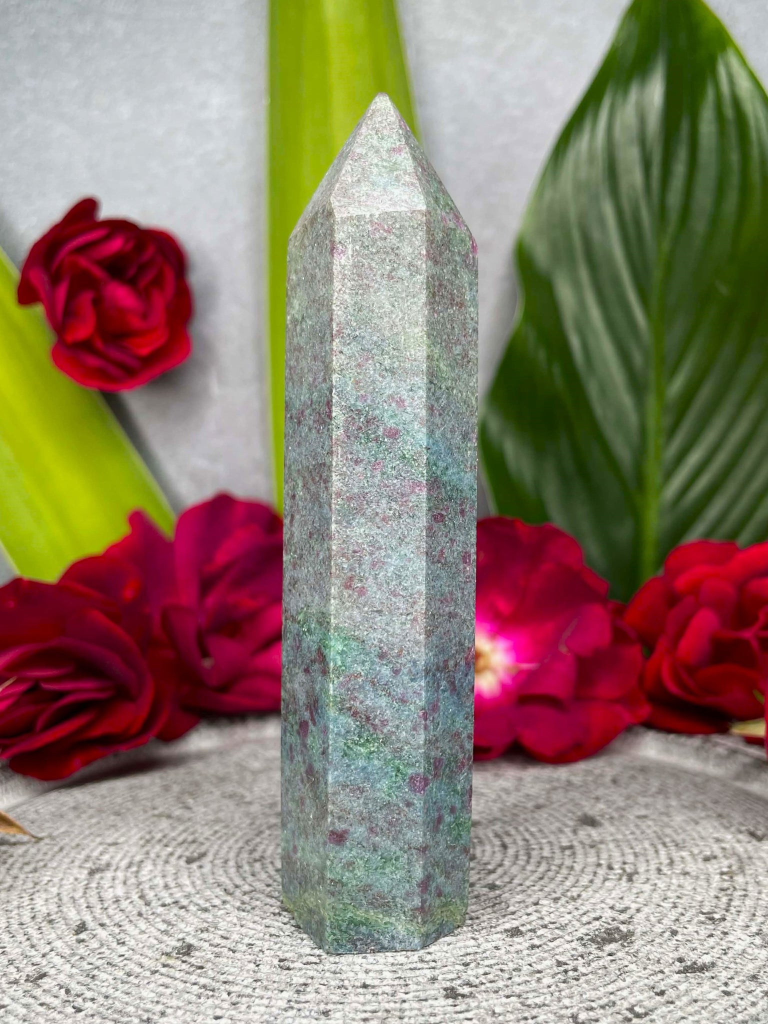 Ruby in Fuchsite with Kyanite is known as a stone of strength, compassion, and spiritual alignment. It is believed to inspire courage, encourage heart-centered healing, and bring clarity by clearing energetic blockages. This combination promotes resilience, emotional balance, and a deeper connection to higher wisdom. In tower form, the crystal’s energy is amplified and directed, making it a meaningful tool for meditation, intention-setting, and personal growth.
