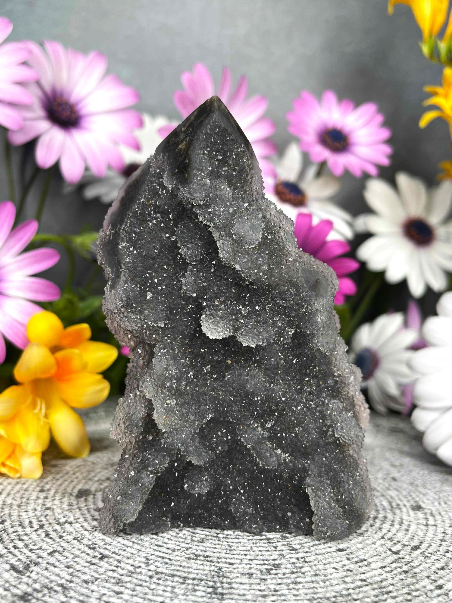 Sphalerite is prized as a stone of grounding, energy, and transformation. It is said to help balance yin and yang energies, boost vitality, and encourage focus during times of change. The druzy inclusions enhance its energy flow, adding an extra layer of sparkle and uplifting vibration. In this freeform tower, it radiates strength, stability, and light in every direction.