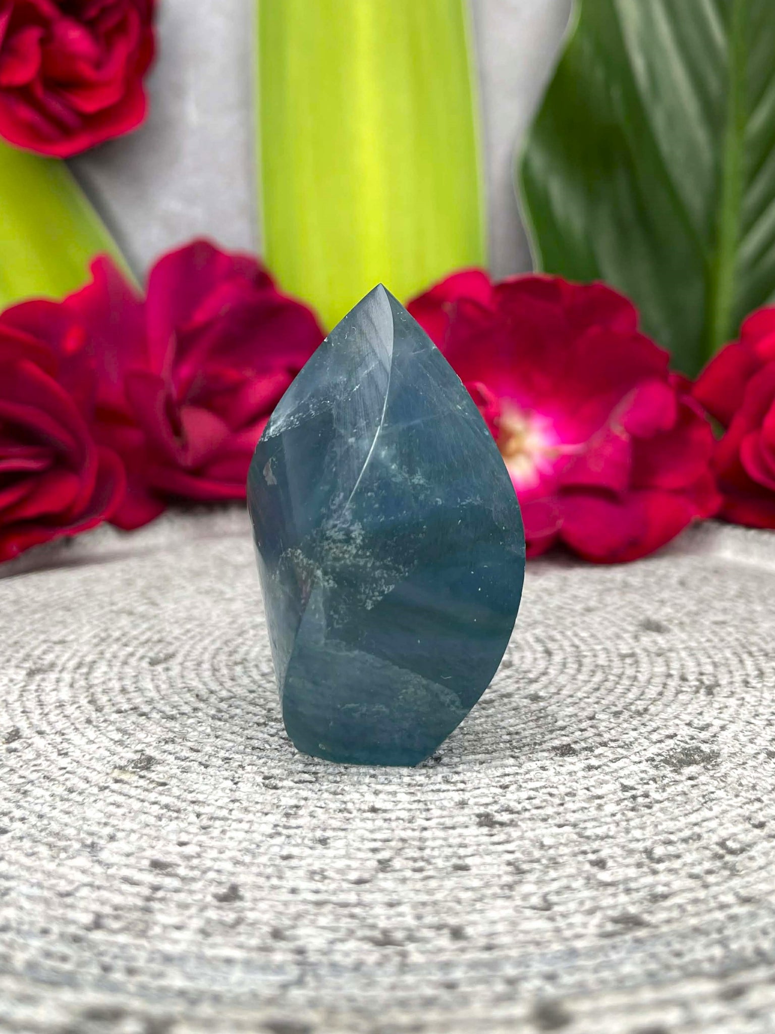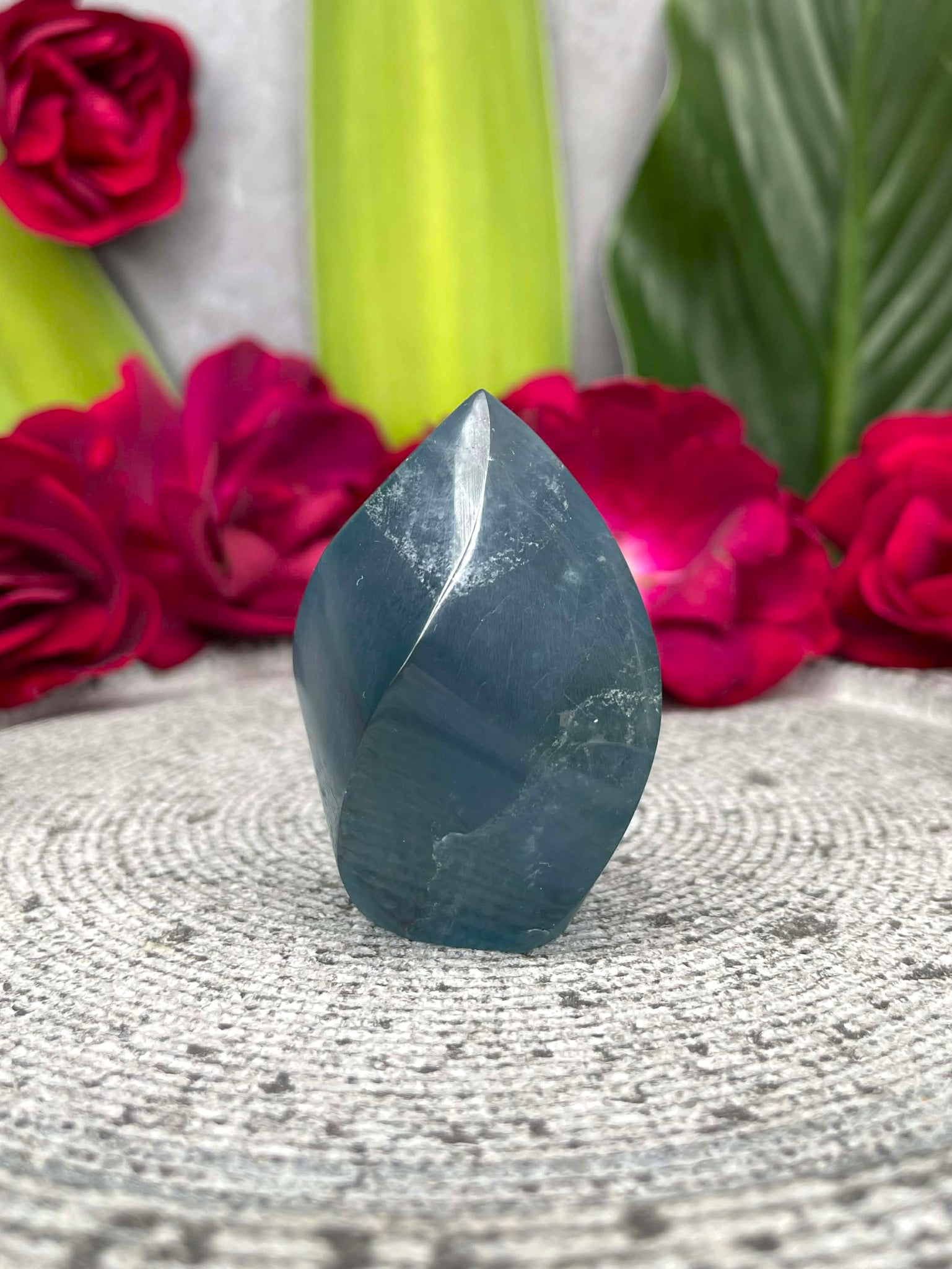 Blue Fluorite is known for enhancing mental clarity, focus, and calm communication, while helping to ease stress and emotional tension. The flame shape symbolises transformation and inner flow, making this piece ideal for meditation, energy work, or as a serene statement crystal that brings clarity and calm into any space.