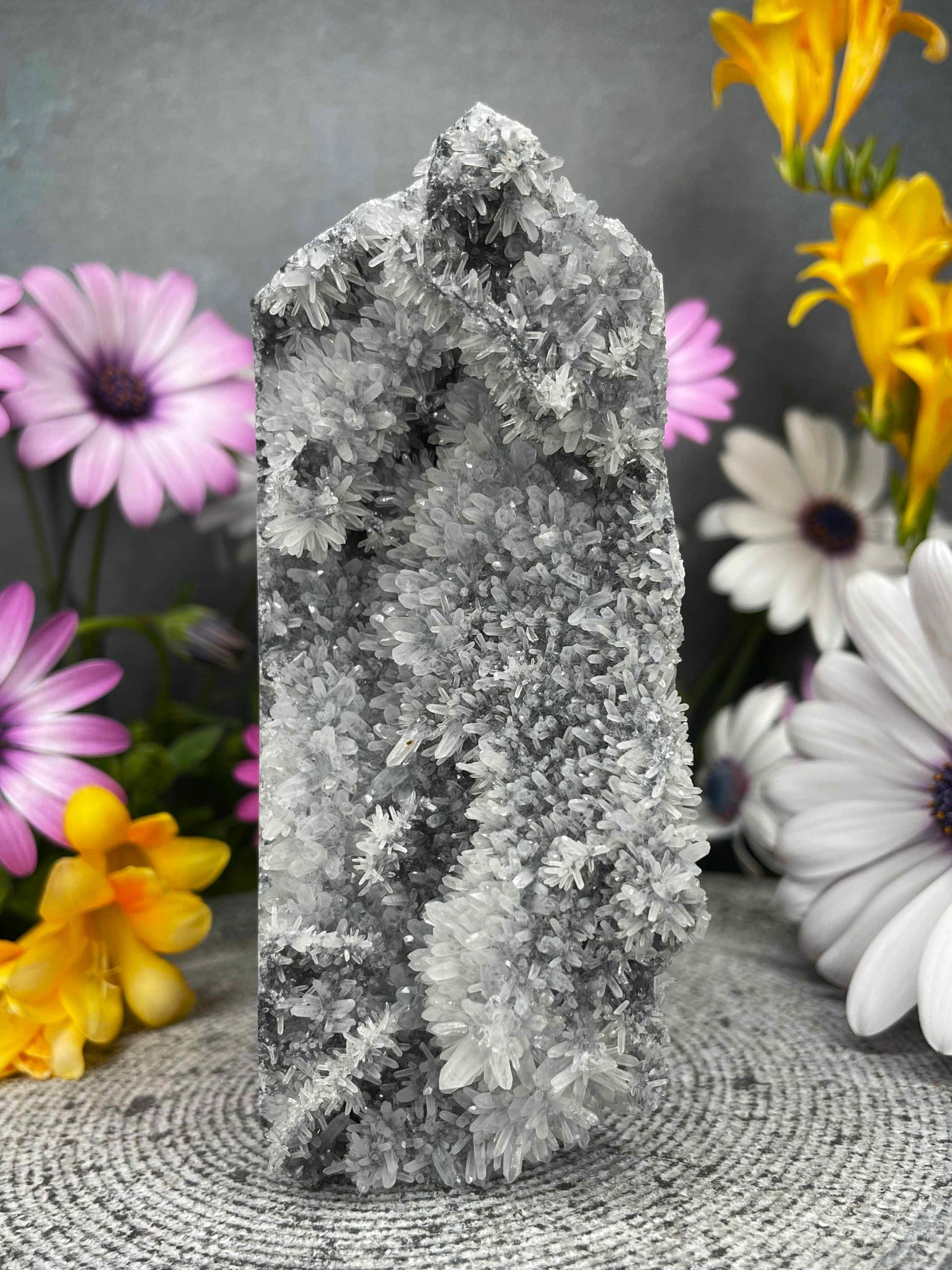 This Chrysanthemum Quartz Tower is a one-of-a-kind piece, showcasing stunning natural flower-like patterns that resemble delicate blossoms formed within the crystal. The front reveals its raw, clustered beauty, while the back has been carefully polished to highlight its unique structure and depth.