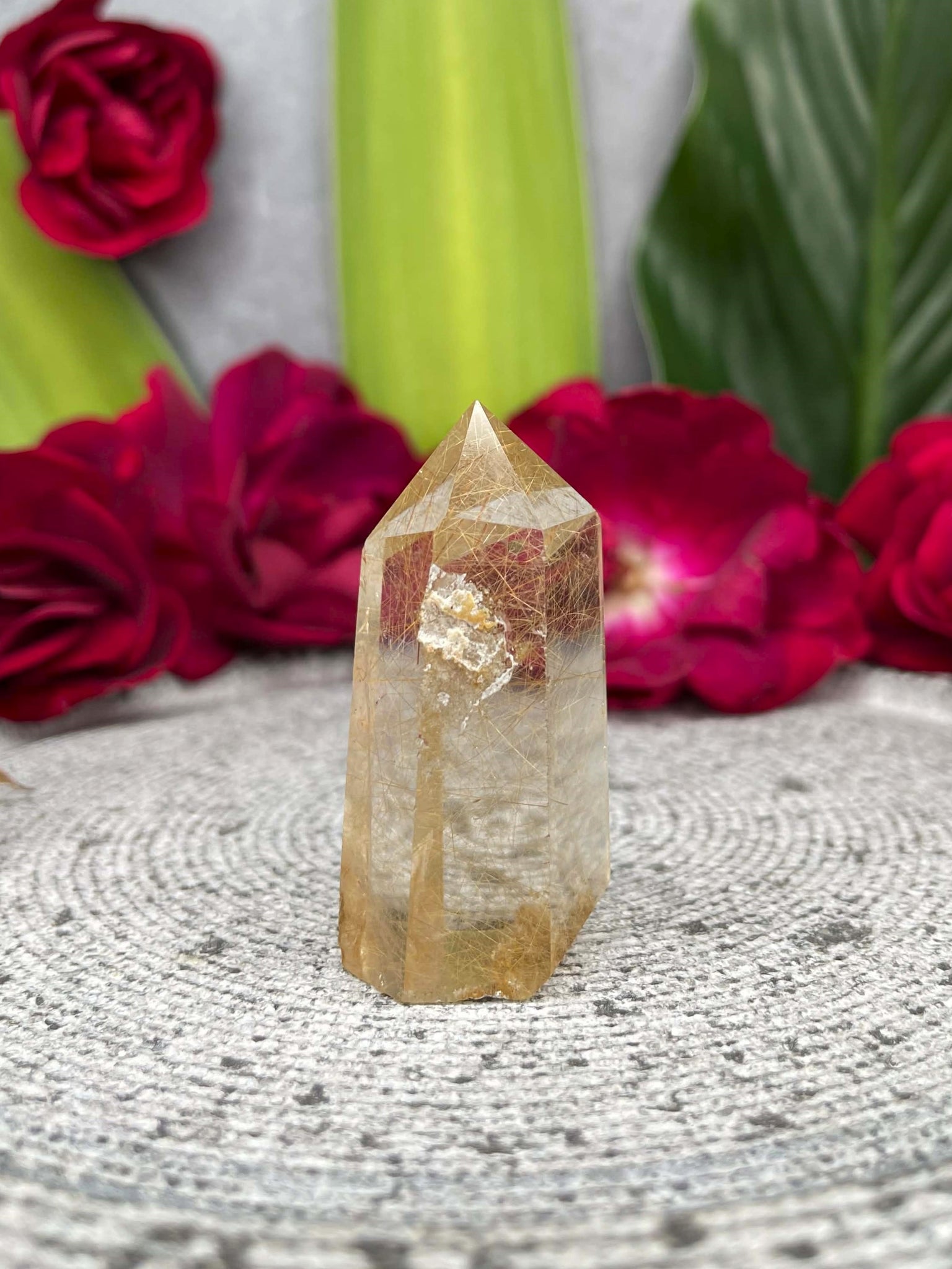 Rutile Quartz is celebrated as a stone of clarity, manifestation, and energy amplification. The golden inclusions are said to illuminate the mind, dissolve negativity, and inspire confidence and creativity. In tower form, it directs this energy upward, enhancing focus, uplifting the spirit, and creating a vibrant, harmonious atmosphere in any space.