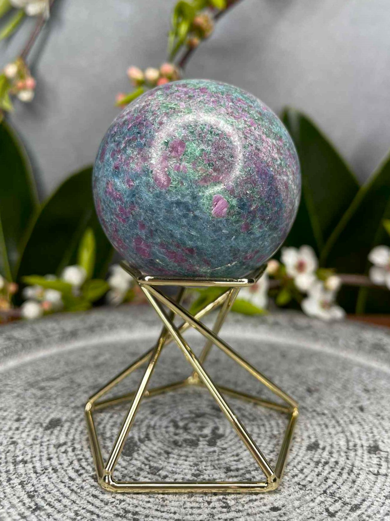 Ruby in Fuchsite with Kyanite is known for its powerful synergy of strength, balance, and spiritual alignment. It is believed to encourage courage, open-hearted compassion, and energetic clarity, helping to dissolve blockages while restoring flow between mind, body, and spirit. This combination is often used to inspire resilience, deeper emotional healing, and connection to higher guidance. Shaped into a sphere, it radiates unity and harmony, making it a meaningful addition to any crystal collection.